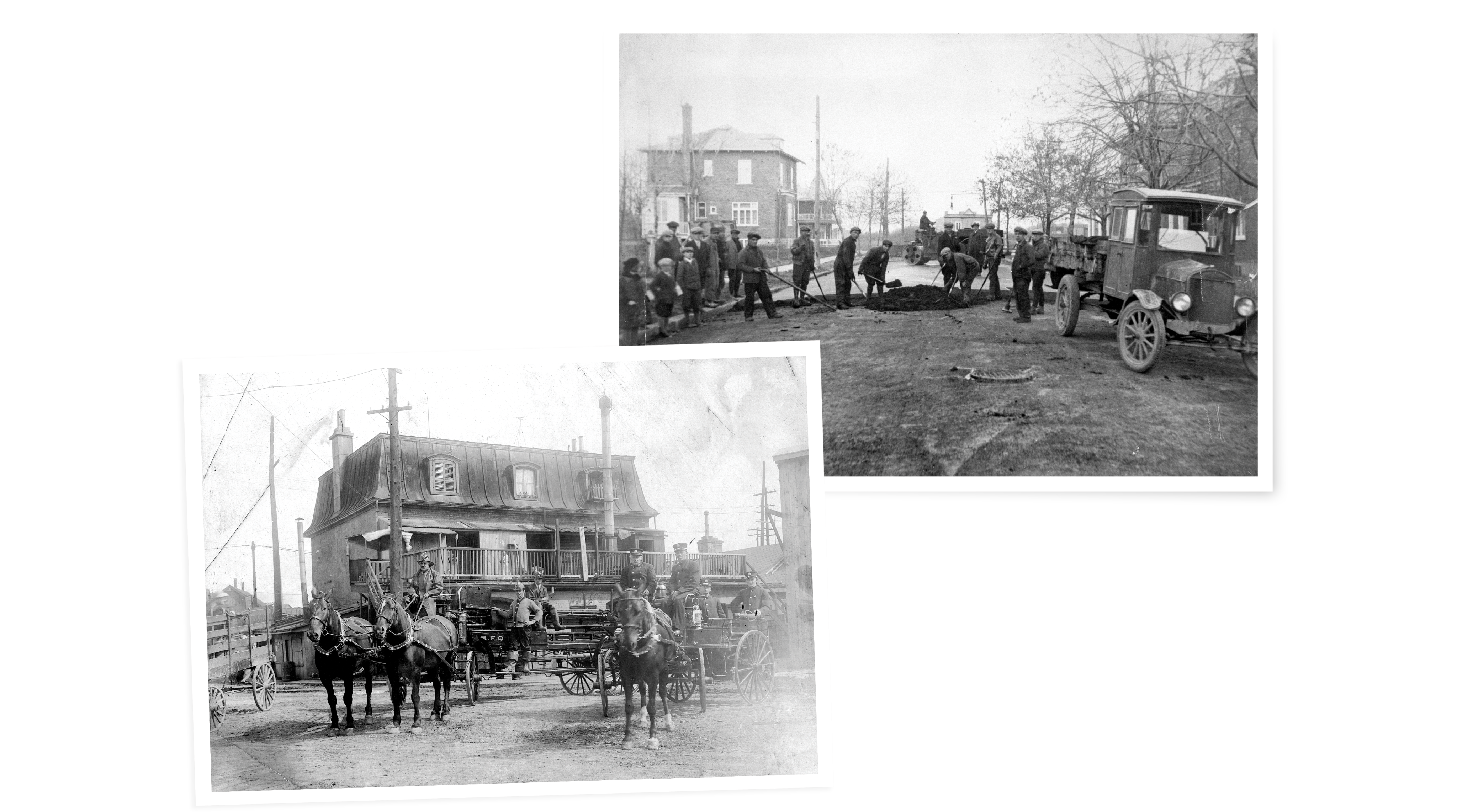 L’asphaltage d’une rue de Québec, en 1925. (Archives Ville de Québec N000374). Attelages de voitures à incendie. (Archives Ville de Québec N016293)
