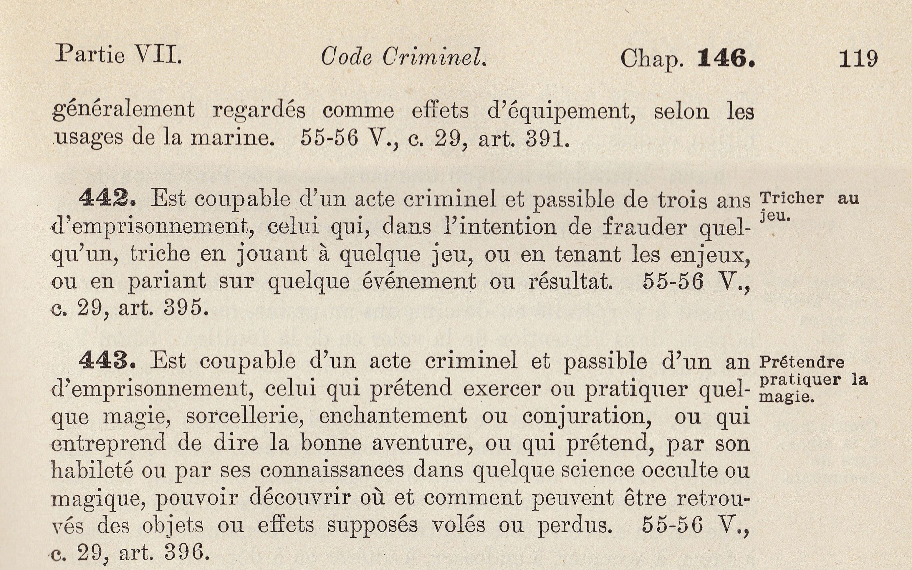 L’article 443 est clair: ceux qui prétendent pratiquer la magie se rendent coupables d’un acte criminel. Coïncidence amusante: l’article 442, qui le précède, condamne la tricherie au jeu… Dure époque pour les magiciens! (Photo Loi criminelle (révision en 1906), Collection du Musée d’histoire de Sherbrooke)