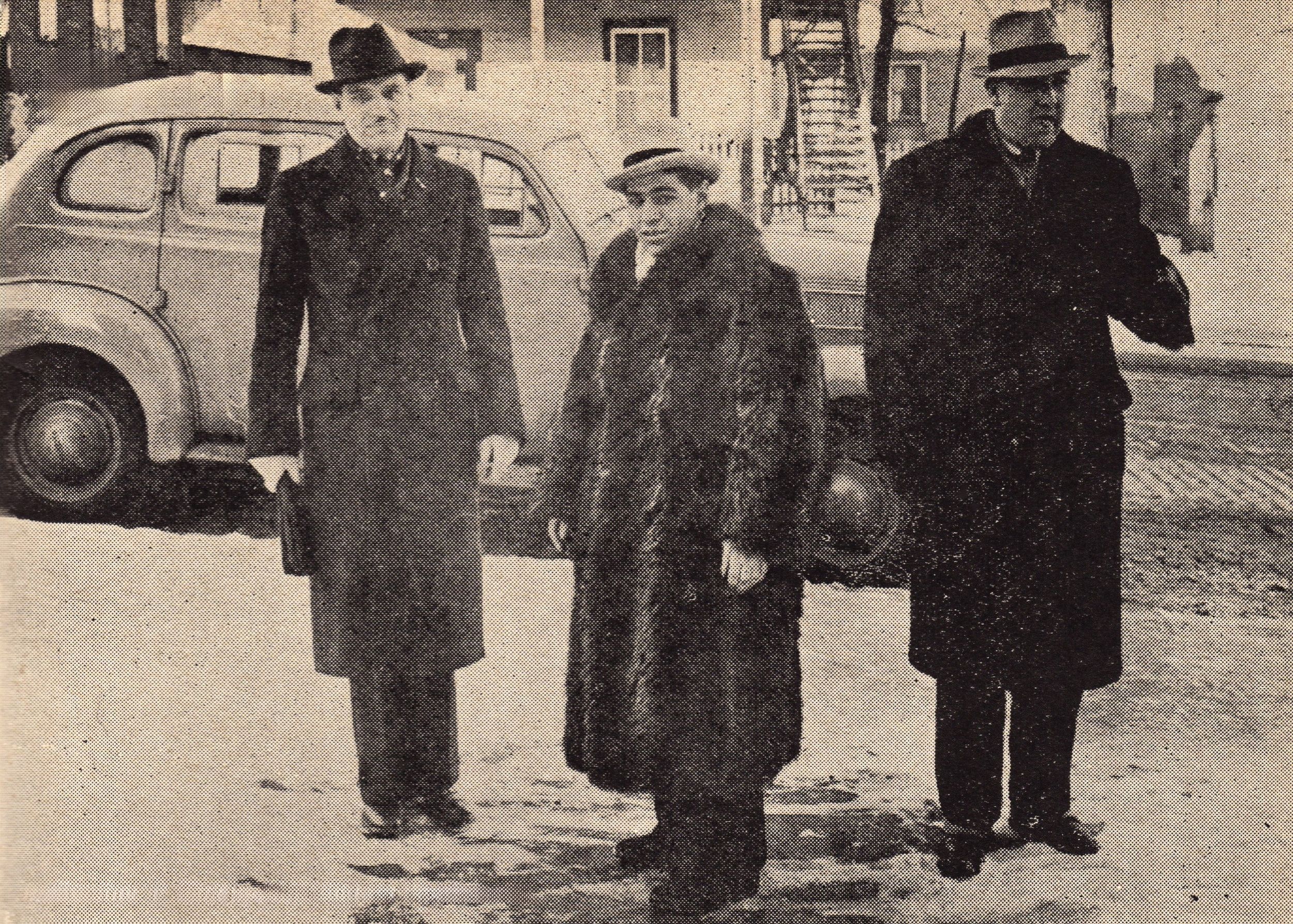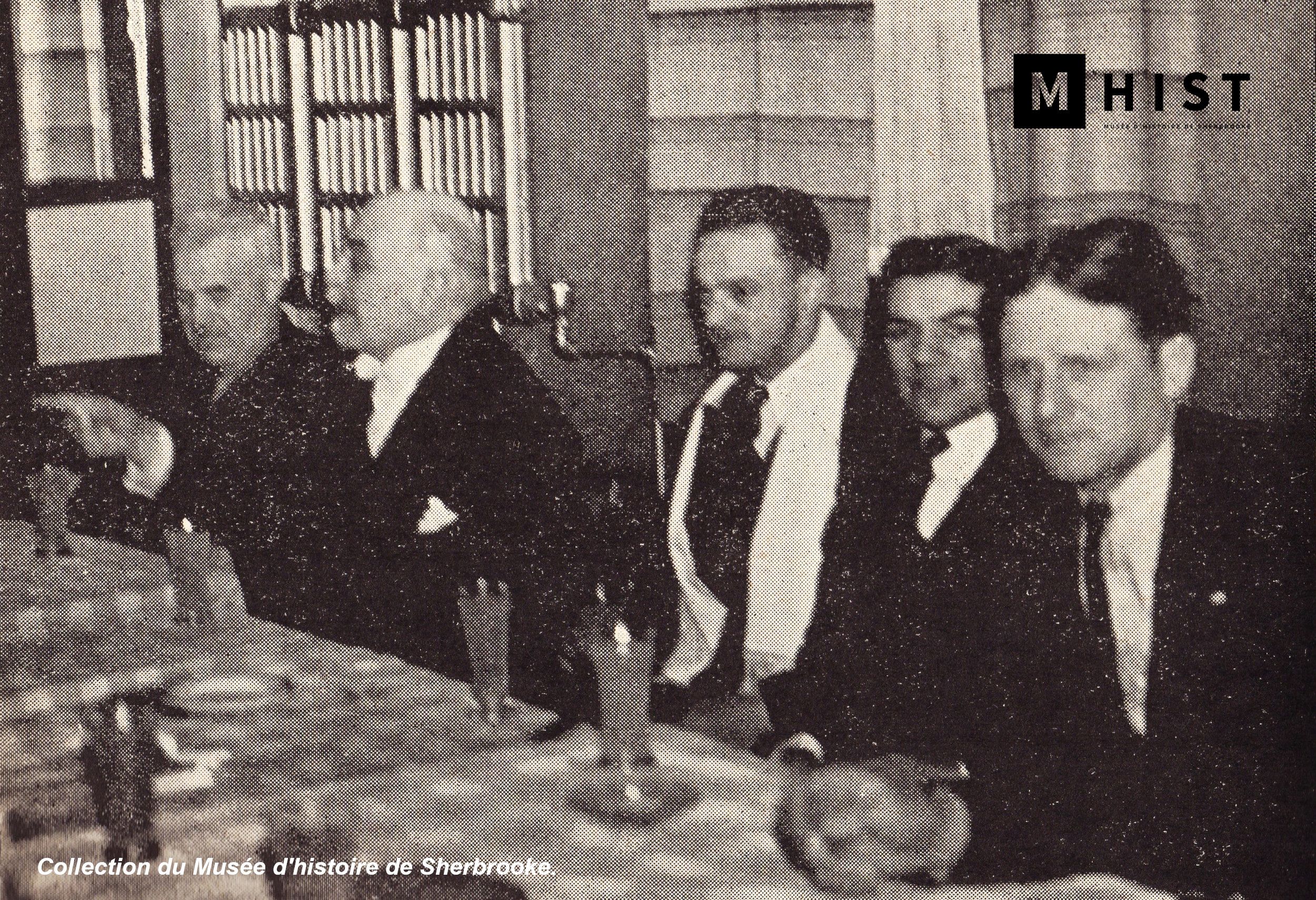 Tout est bien qui finit bien… Après l’annonce de sa non-culpabilité, Desfossés s’en va fêter sa victoire judiciaire à l’Hôtel New Wellington avec ses partisans et ses avocats, maîtres Émile Rioux et Armand Nadeau. (Photo Il faut le mettre en prison, Sherbrooke, en 1939, Collection du Musée d’histoire de Sherbrooke)