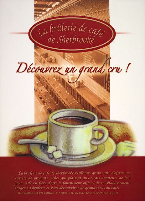 Affiche de la Brûlerie de café située au 180 rue Wellington Nord. On peut voir un aperçu de la vue intérieure de la brûlerie qui est partiellement cachée par la raison sociale placée dans un ovale et par une grosse tasse de café. Un message concernant la qualité des produits est écrit au bas de l’affiche, en 2005. (Photo Fonds Musée d'histoire de Sherbrooke)