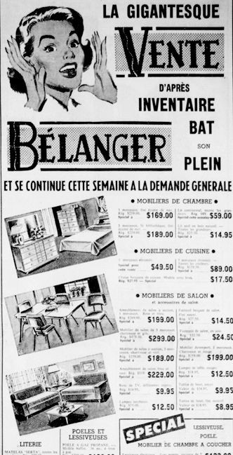 Image de la publicité de Bélanger Inc.: «Vente gigantesque, rabais, etc.» (Photo La Tribune, 29 février 1956)