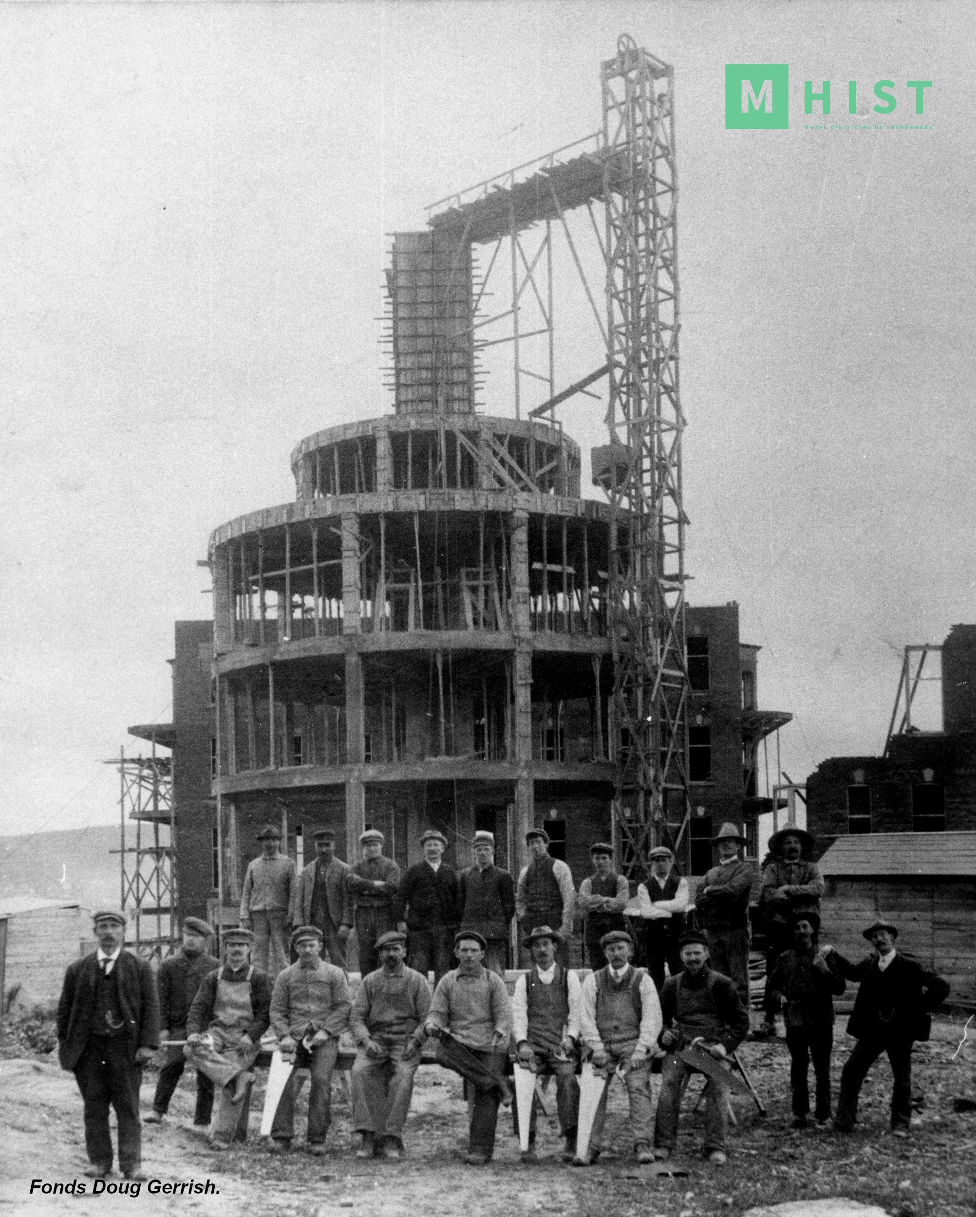 La construction de la rotonde de l’Hôpital Saint-Vincent débute en 1906 et s’étale sur deux ans. Sur cette photo, ouvriers et contremaîtres prennent la pose, les charpentiers mettant leurs outils en évidence. (Photo Fonds Doug Gerrish, Mhist)