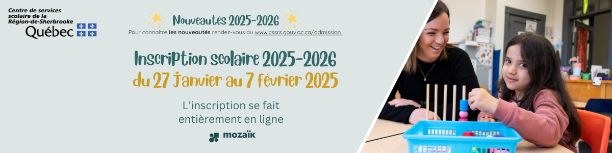 Il est important d’inscrire votre enfant durant cette période, car après celle-ci, la date d’inscription sera utilisée en cas de dépassement de la capacité d’accueil des écoles. C’est aussi vrai si votre enfant fréquente déjà une école du CSSRS. Vous devriez d’ailleurs avoir reçu la documentation nécessaire pour procéder à sa réinscription, d’ici au 7 février.
