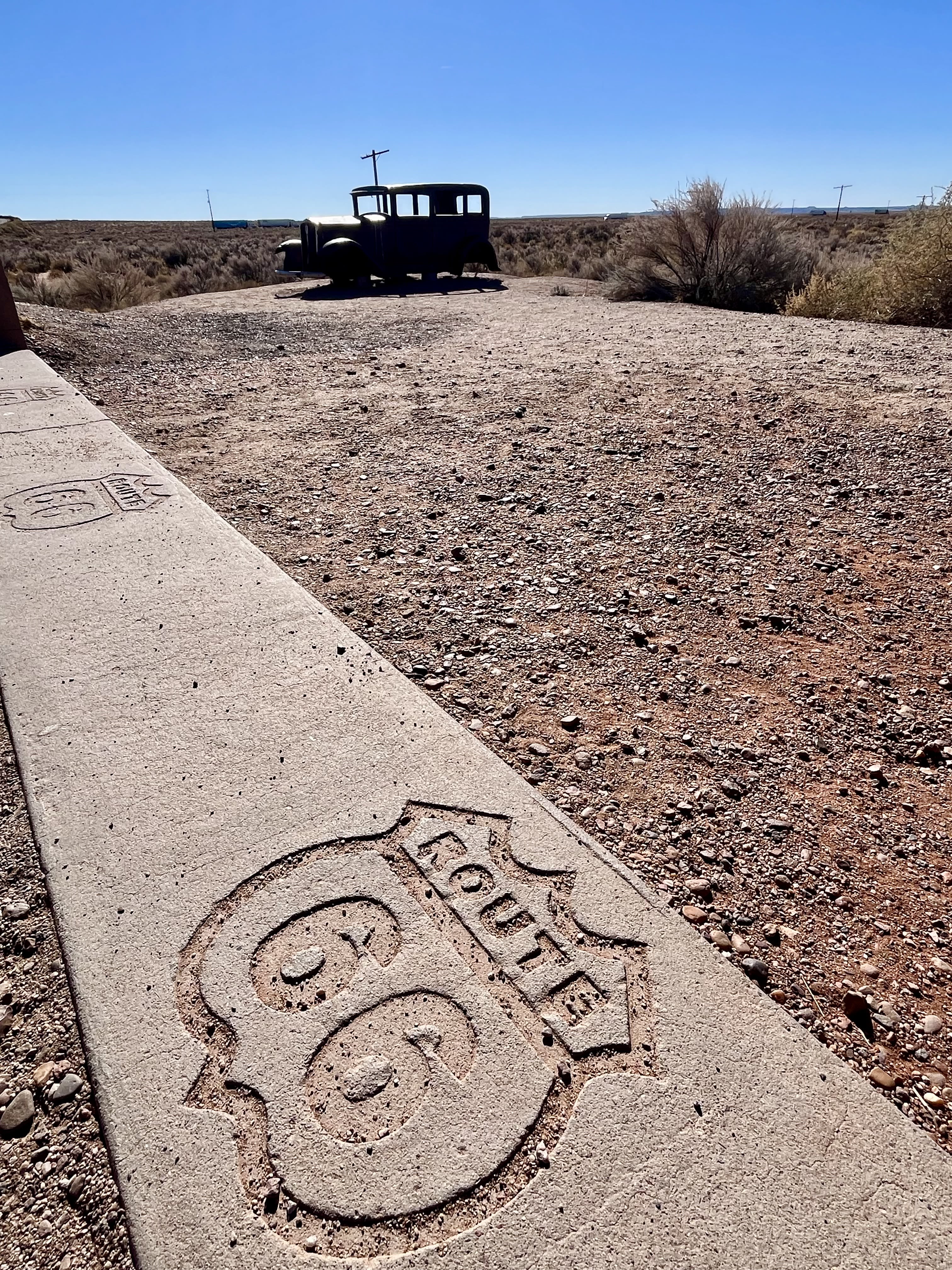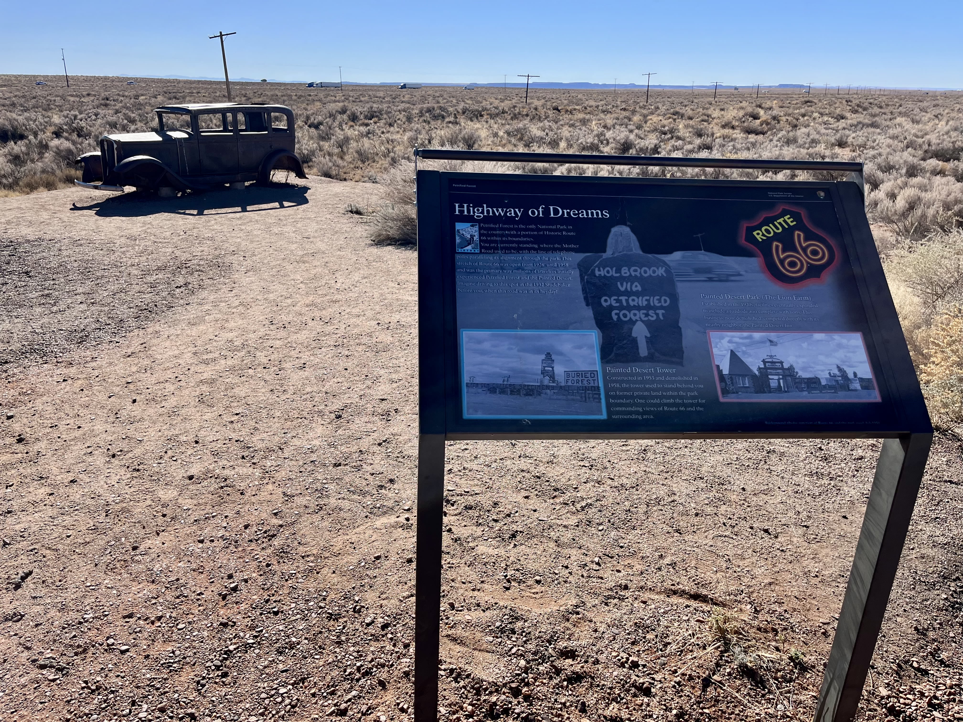 Dans Petrified Forest, on peut marcher dans les badlands, voir de réels pétroglyphes à l’aide de jumelles, et croiser le trajet original de la Route 66. Le squelette d’une voiture ancienne se tient encore sur l’ancien tracé.