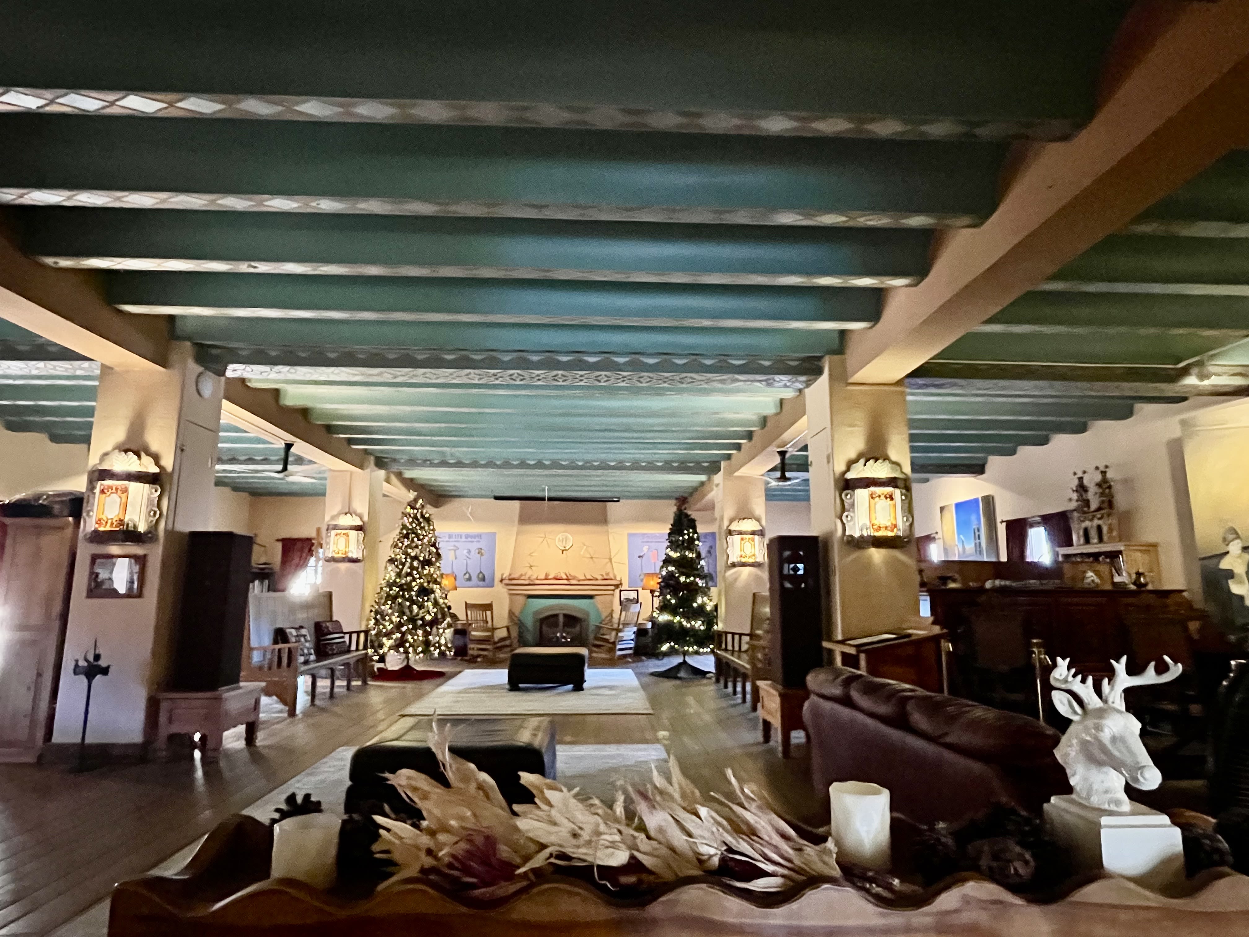 La salle commune de l'hôtel La Posada, avec son foyer et sa riche décoration. (Jonathan Custeau/La Tribune)