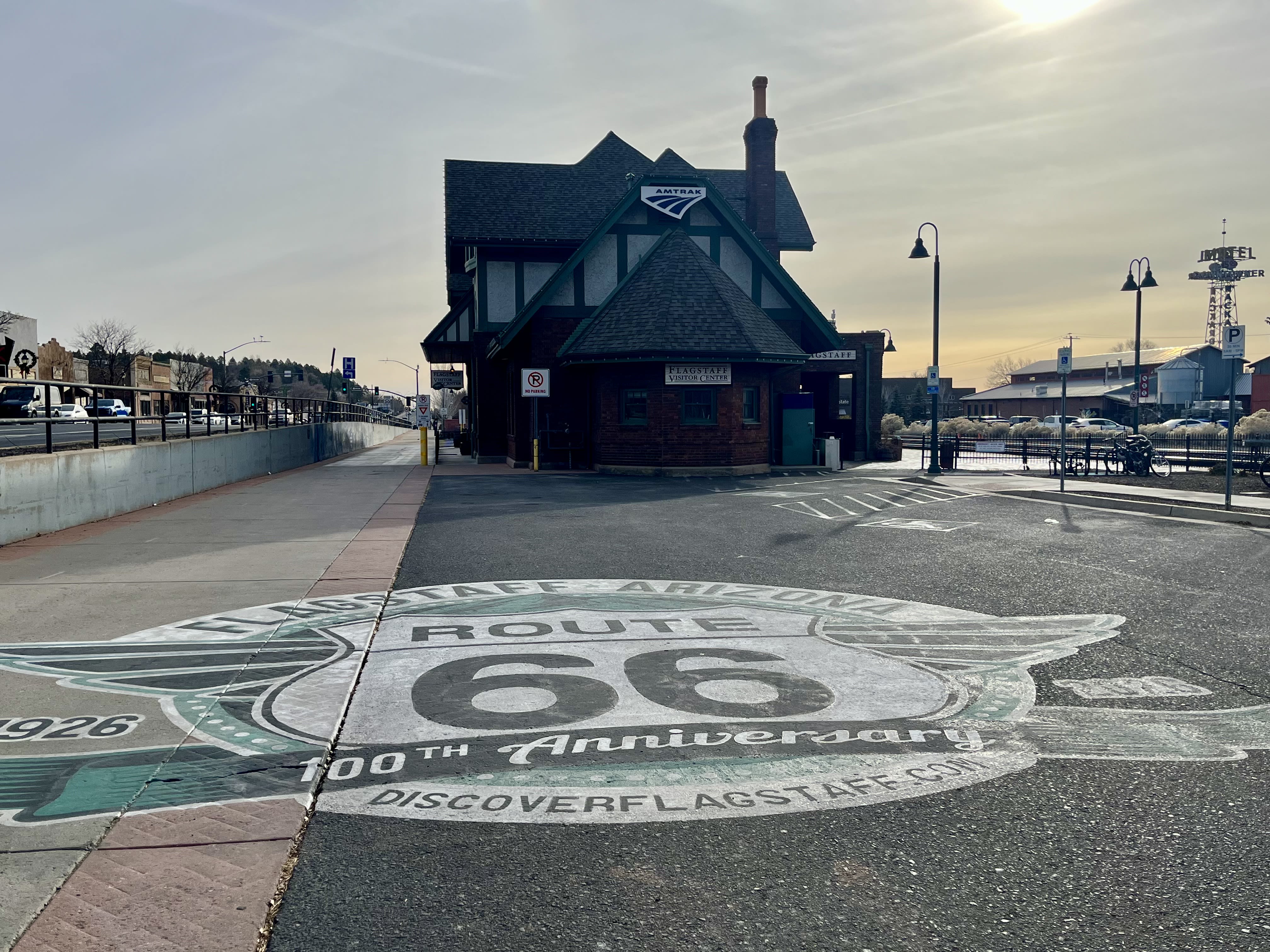 La gare de Flagstaff agit aussi comme centre des visiteurs. On y trouve un logo surdimensionné de la Route 66. (Jonathan Custeau/La Tribune)