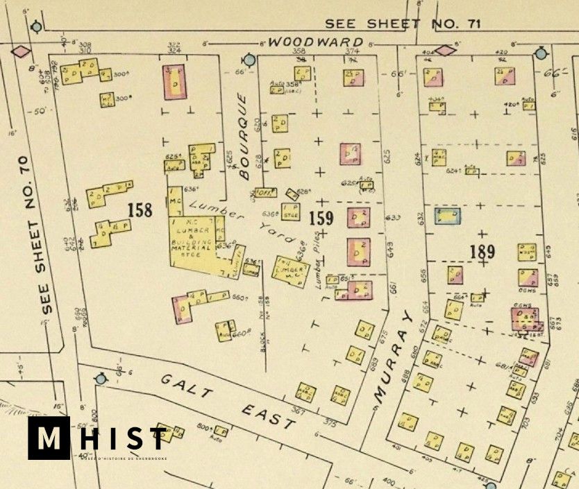 Il y a près d’un siècle, le commerce de bois de Johnny Bourque s’implantait dans l’est de la ville. L’adresse? Sur la rue Bourque, bien sûr! (Plan d’assurance-incendie de 1953, Collection du Musée d’histoire de Sherbrooke)