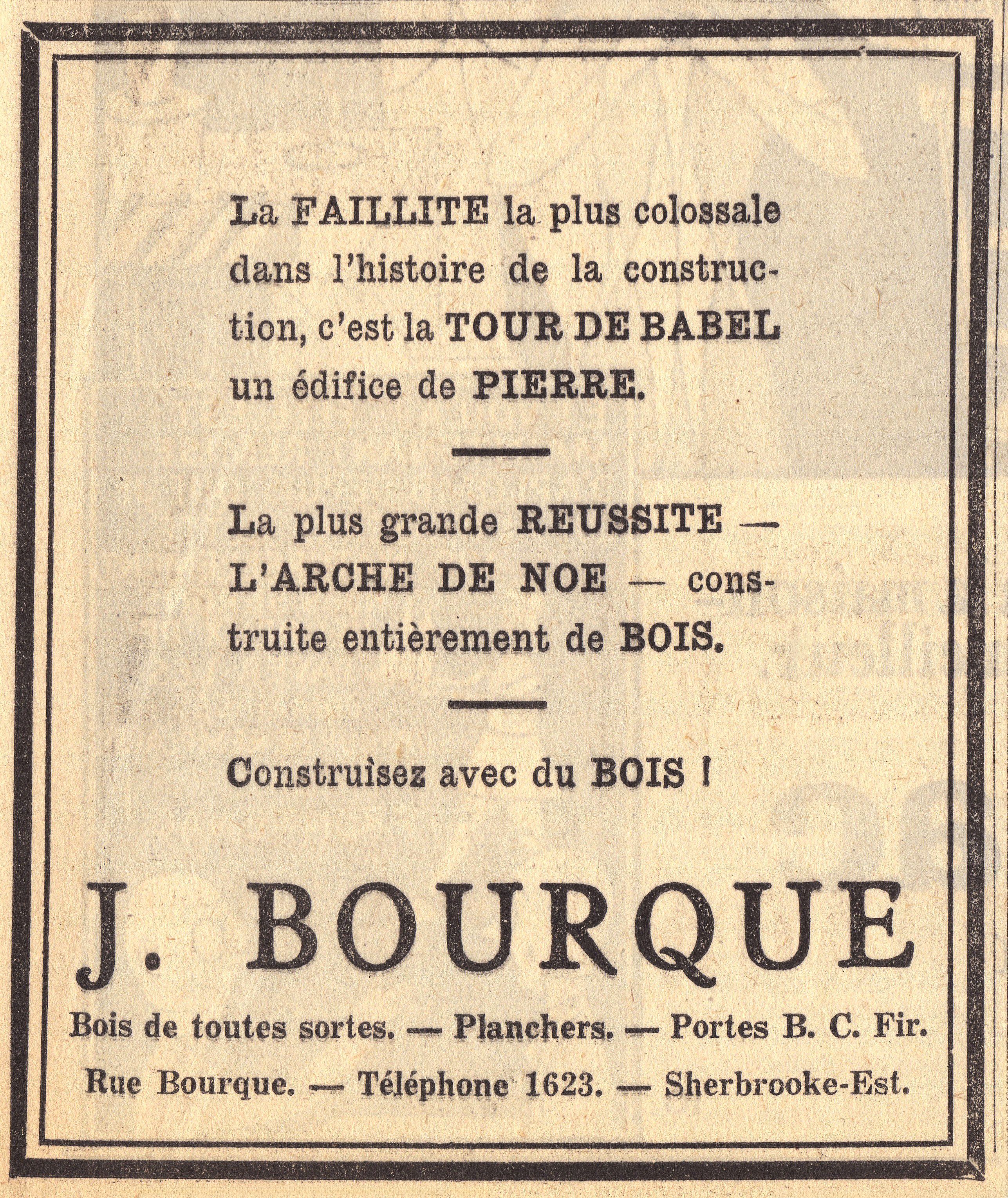 Déjà en 1930, «Johnny» Bourque affiche ses activités commerciales dans La Tribune et semble avoir déjà le sens des affaires… Et de la formule! (Photo La Tribune, 12 avril 1930)