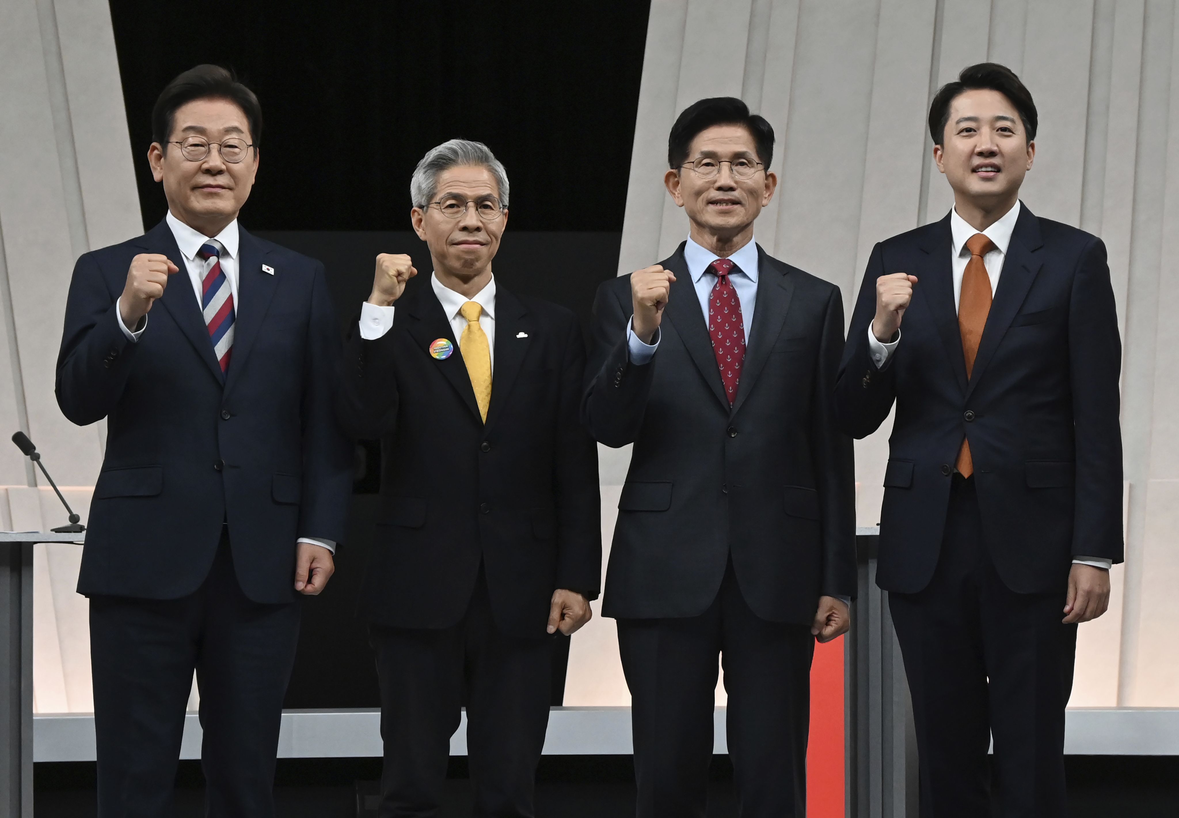 De gauche à droite: les candidats à la présidentielle sud-coréenne, Lee Jae-myung du Parti démocrate, Kwon Young-guk du Parti démocrate du travail, Kim Moon-soo du Parti du pouvoir populaire et Lee Jun-seok du Parti de la nouvelle réforme, posent pour une photo avant le troisième débat télévisé pour l'élection présidentielle du 3 juin, au studio MBC, le 27 mai 2025 à Séoul, en Corée du Sud. (Kim Min-hee/Kyodo/Archives AP)
