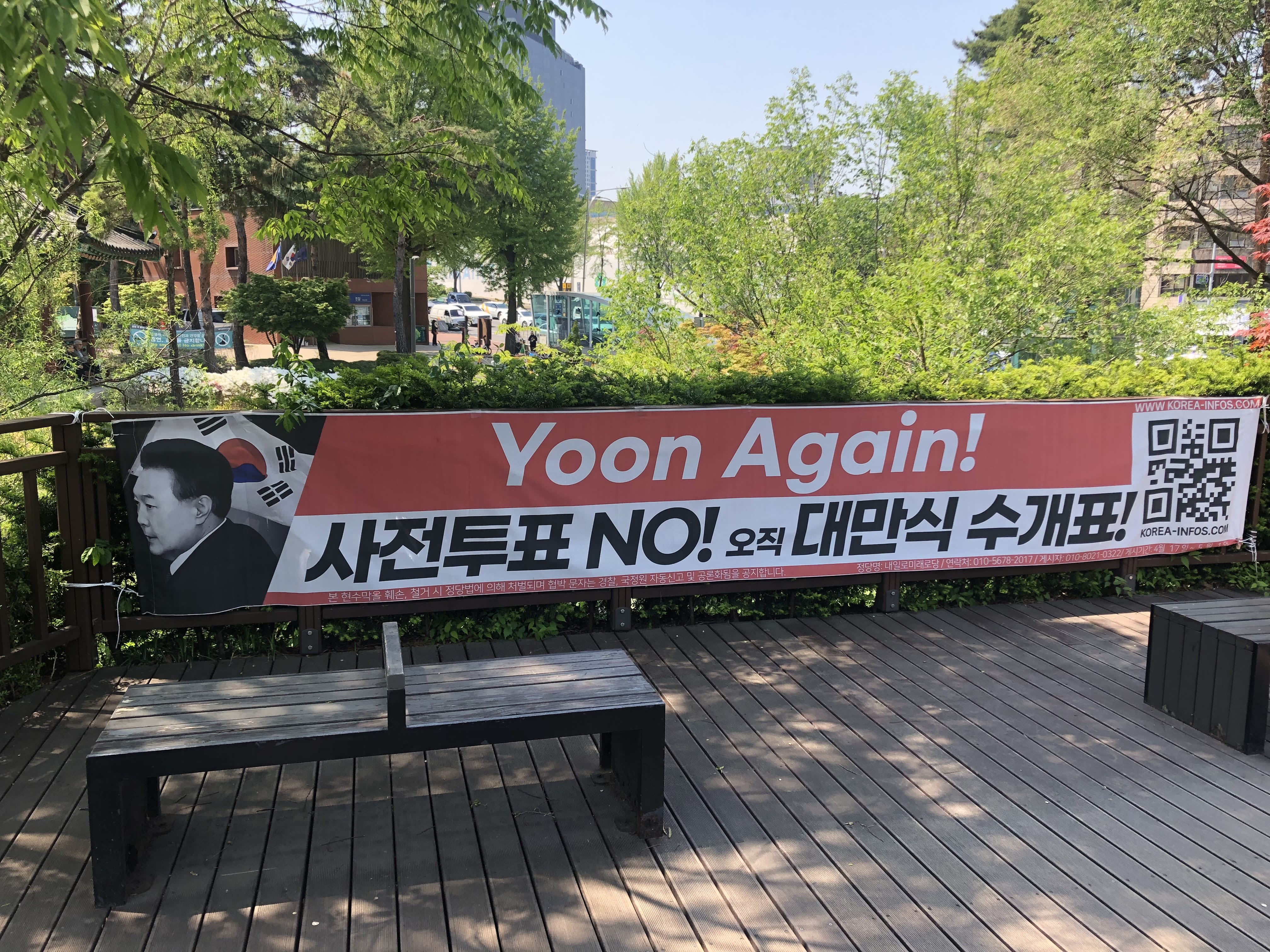 Affiche électorale du président déchu Yoon Suk-yeol, à Séoul. Le clin d’œil à Donald Trump apparaît évident. «Yoon again» pour «Make Korea Great Again». Après le MAGA américain, Monsieur proposait le MKGA coréen. (Jean-Simon Gagné/Le Soleil)