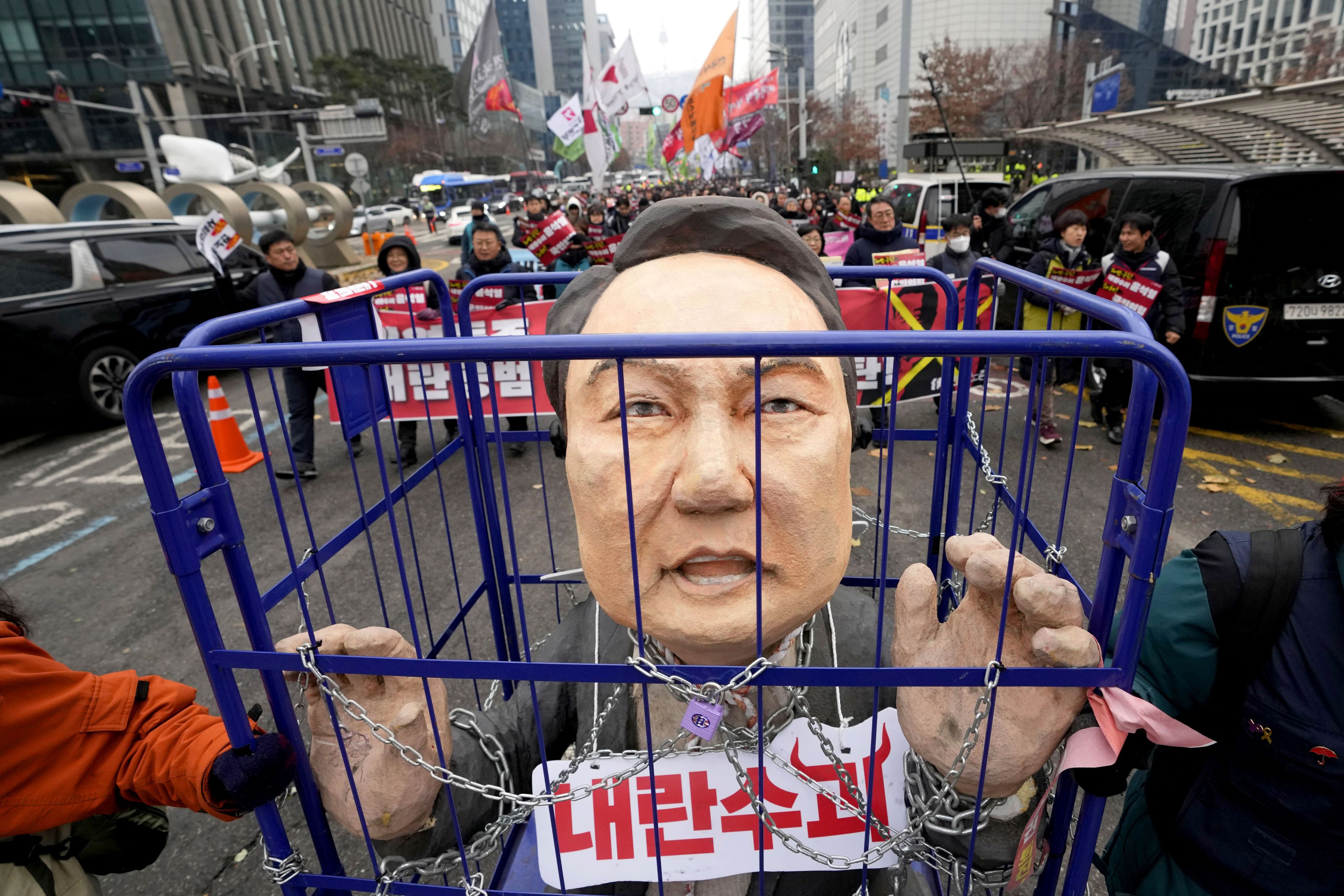 Durant tout l’hiver, de nombreux manifestants réclament l’emprisonnement du président Yoon Suk-yeol. Destitué par l’Assemblée nationale de Corée, le président déchu se retrouve aujourd’hui devant la justice pour avoir mené une «insurrection». (Ahn Young-joon/Archives AP)