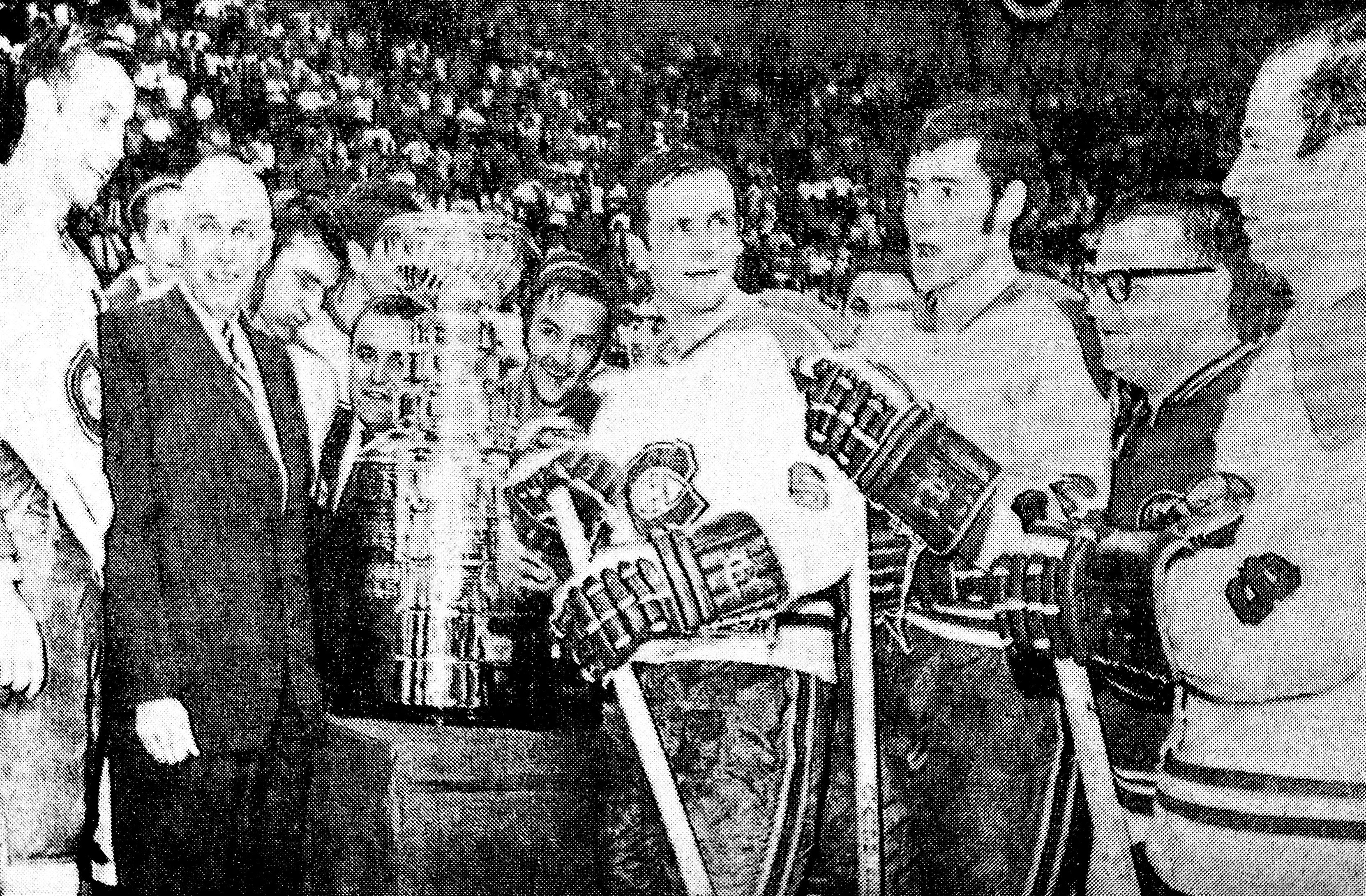 Claude Ruel devient un héros local lorsqu’il mène le Canadien de Montréal à la coupe Stanley de 1969. On l’aperçoit, presque caché, sur la gauche du trophée. (Photo La Tribune, 8 mai 1969)