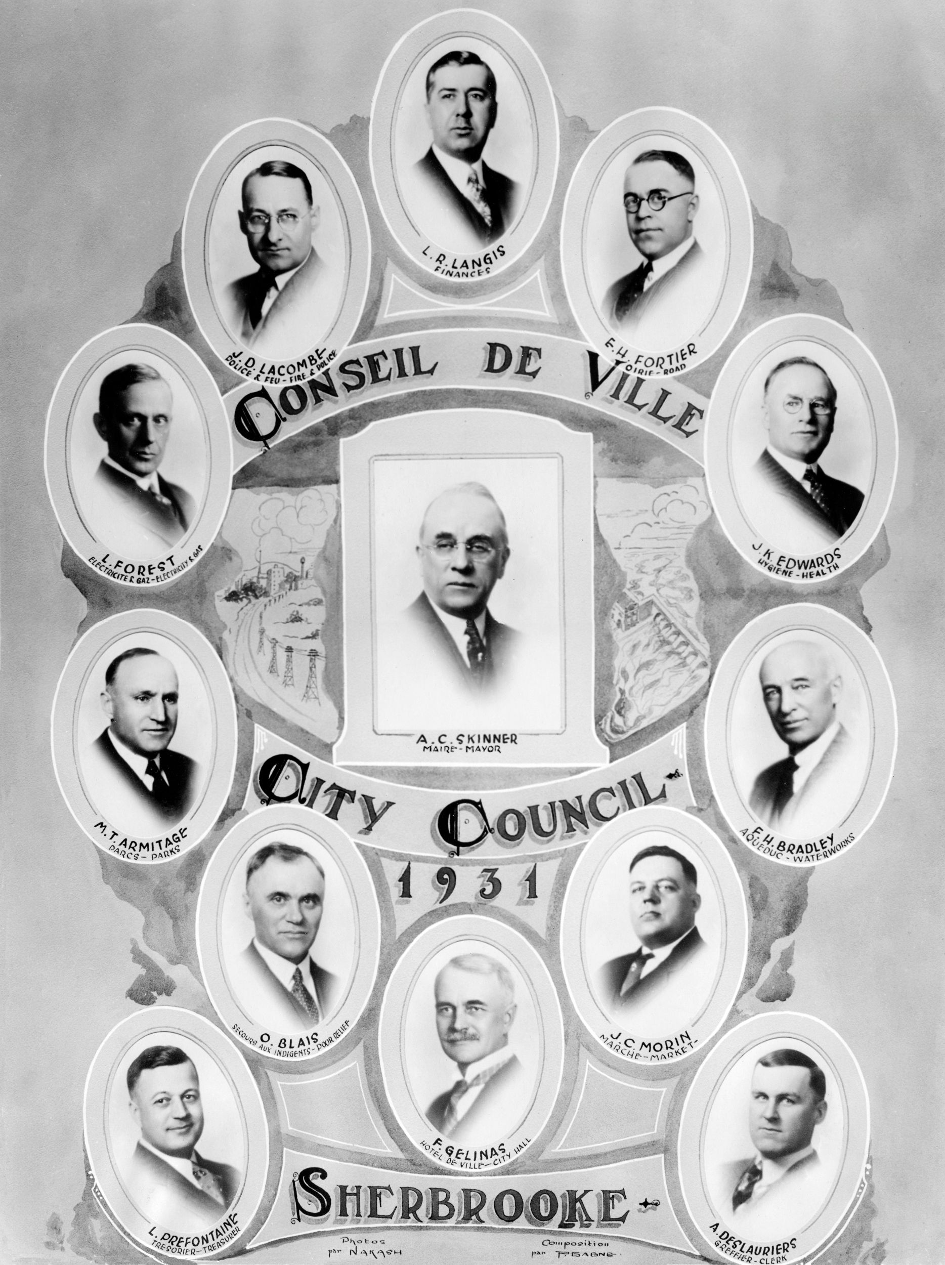 Les treize portraits des conseillers municipaux et du maire de Sherbrooke en 1931. Jusqu’en 1889, leur nombre était de sept seulement. (Photo Collection du Musée d’histoire de Sherbrooke)