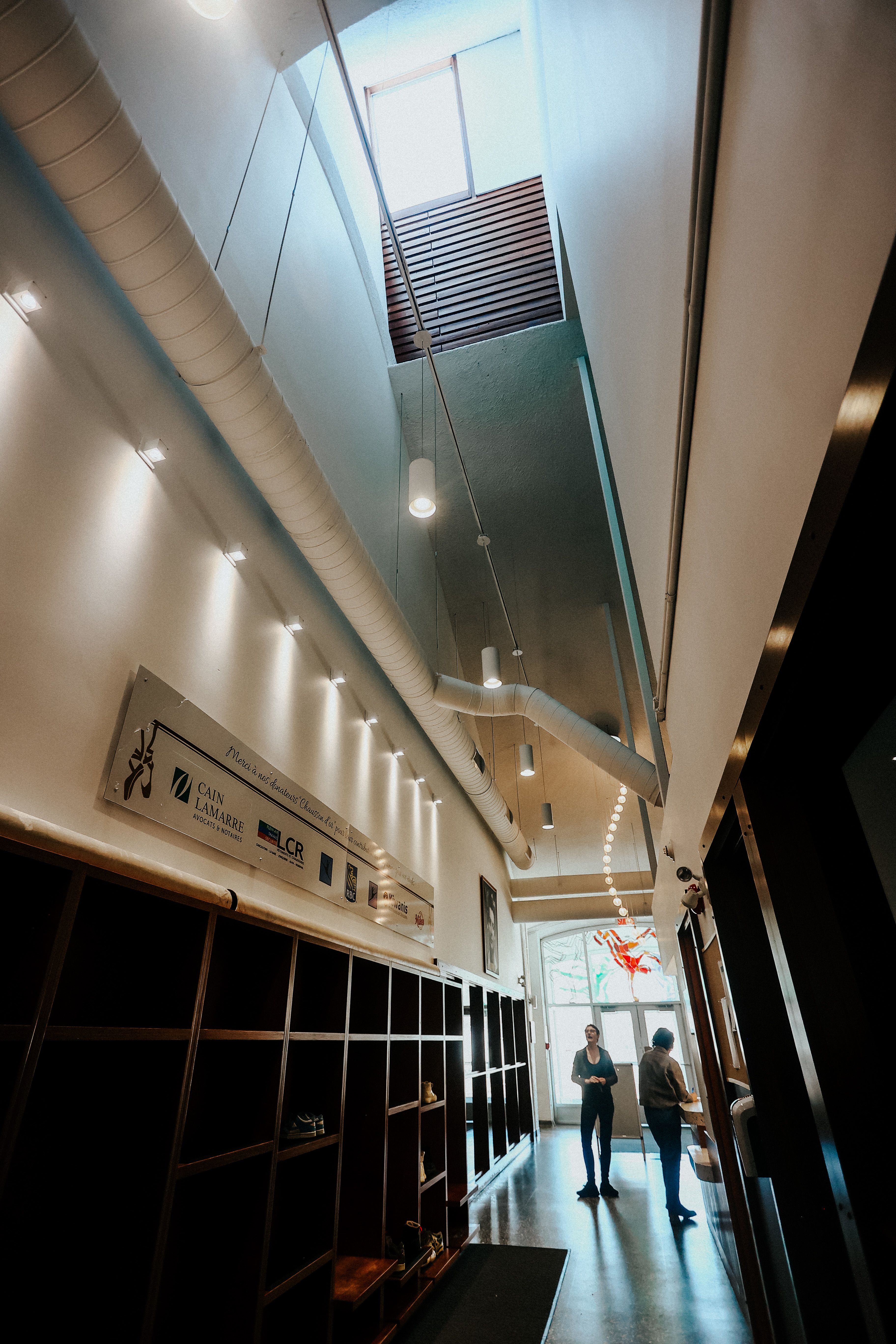 Ce qui frappe en entrant, c’est la hauteur des plafonds, les grandes fenêtres et toute cette luminosité. Puis, les matériaux nobles. «Nous avons conservé les planchers et les comptoirs. Nous avons aussi utilisé du bois pour être en harmonie. Il faut dire que le bâtiment avait été très bien préservé. Le plus compliqué a été la ventilation et le chauffage», détaille Mme Morin. On y compte cinq studios, dont un avec une estrade, qui se transforme en salle de culte le samedi pour accueillir une messe.