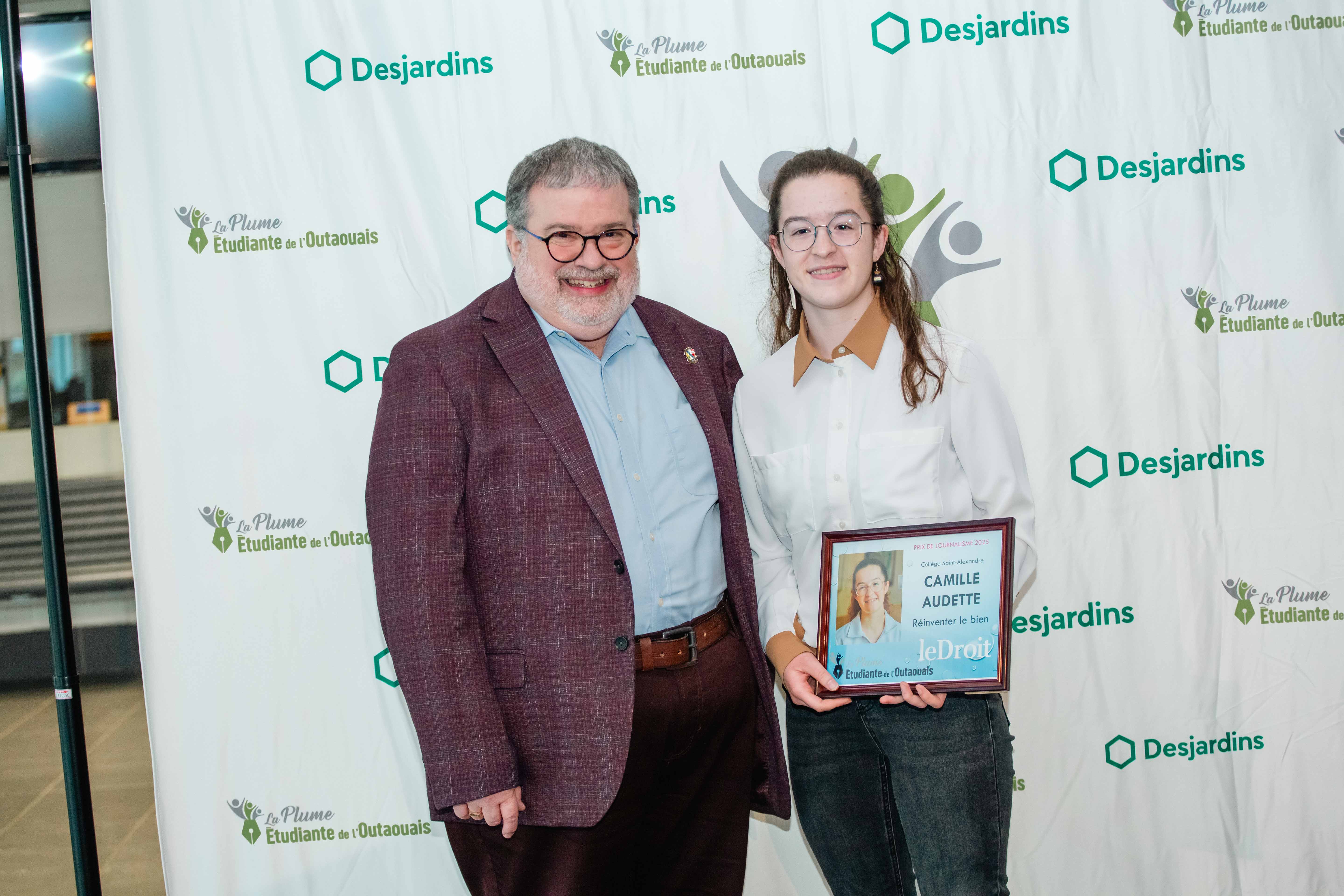 Pierre Marinier, directeur des services pédagogiques au Collège Saint-Alexandre, a remis le prix de journalisme à Camille Audette du Collège Saint-Alexandre.