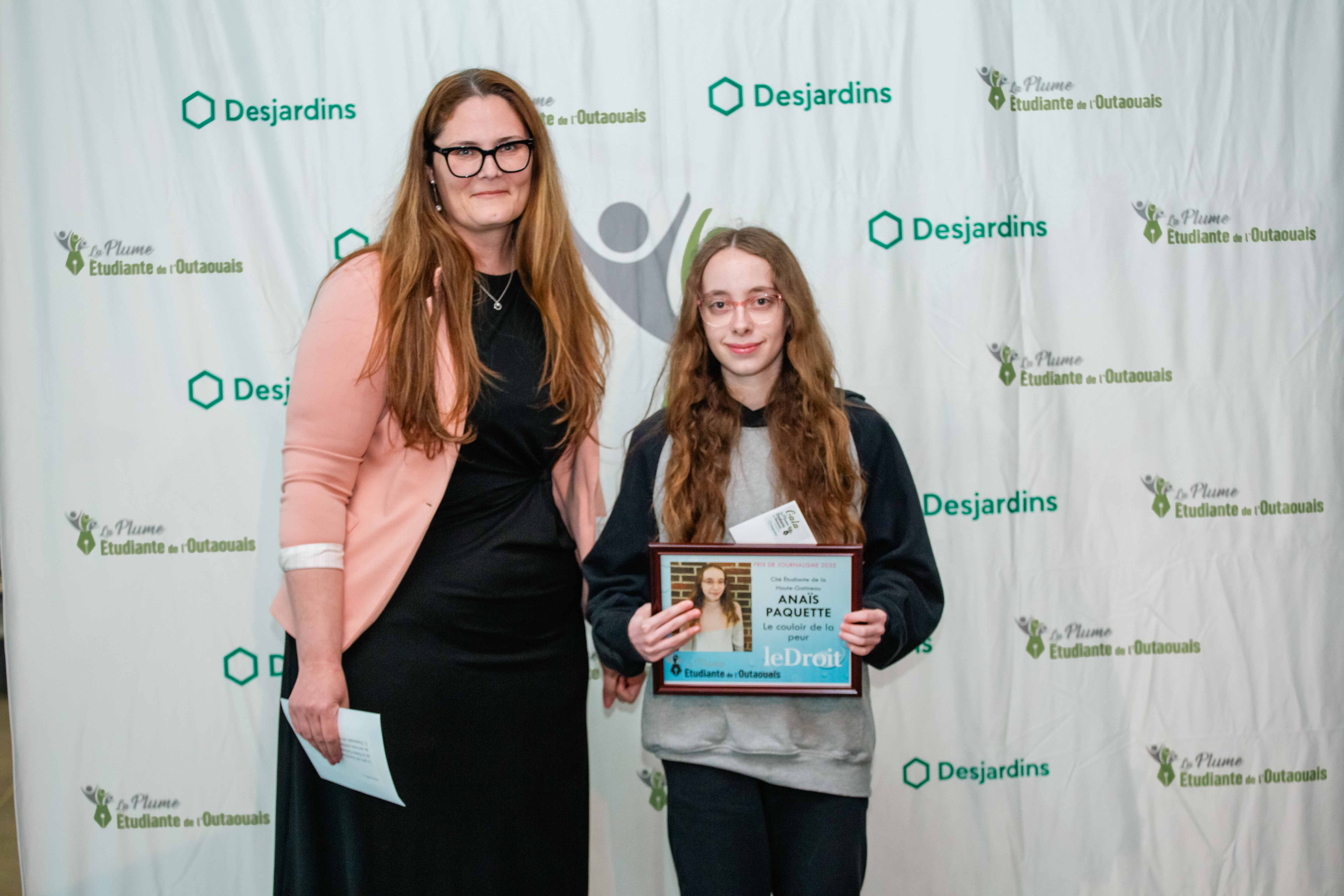 Anaïs Paquette a mérité le prix de journalisme à la Cité Étudiante de la Haute-Gatineau à Maniwaki. Prix décerné par la directrice générale du Centre de services scolaire des Hauts-Bois-de-l’Outaouais, Nadine Carpentier.