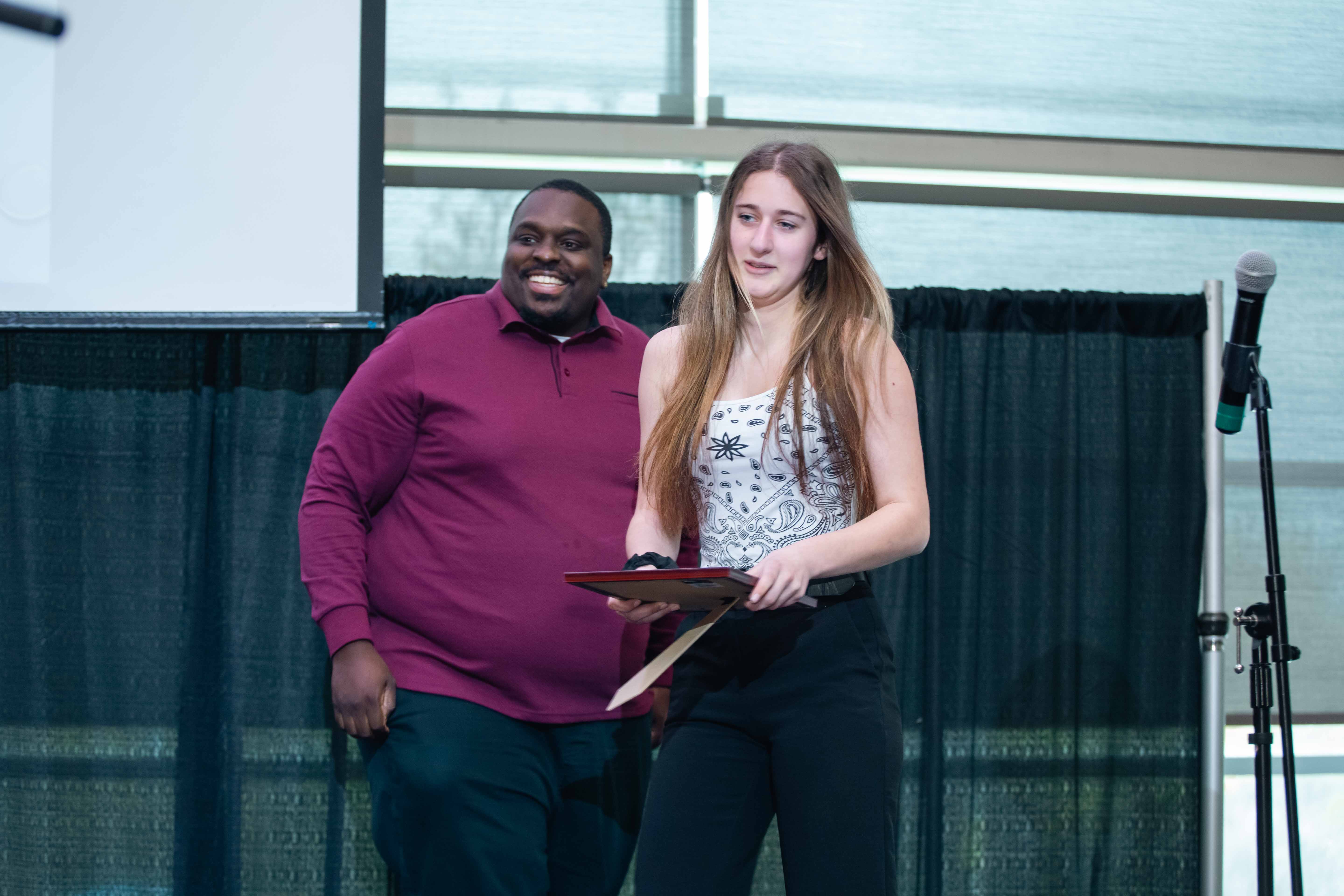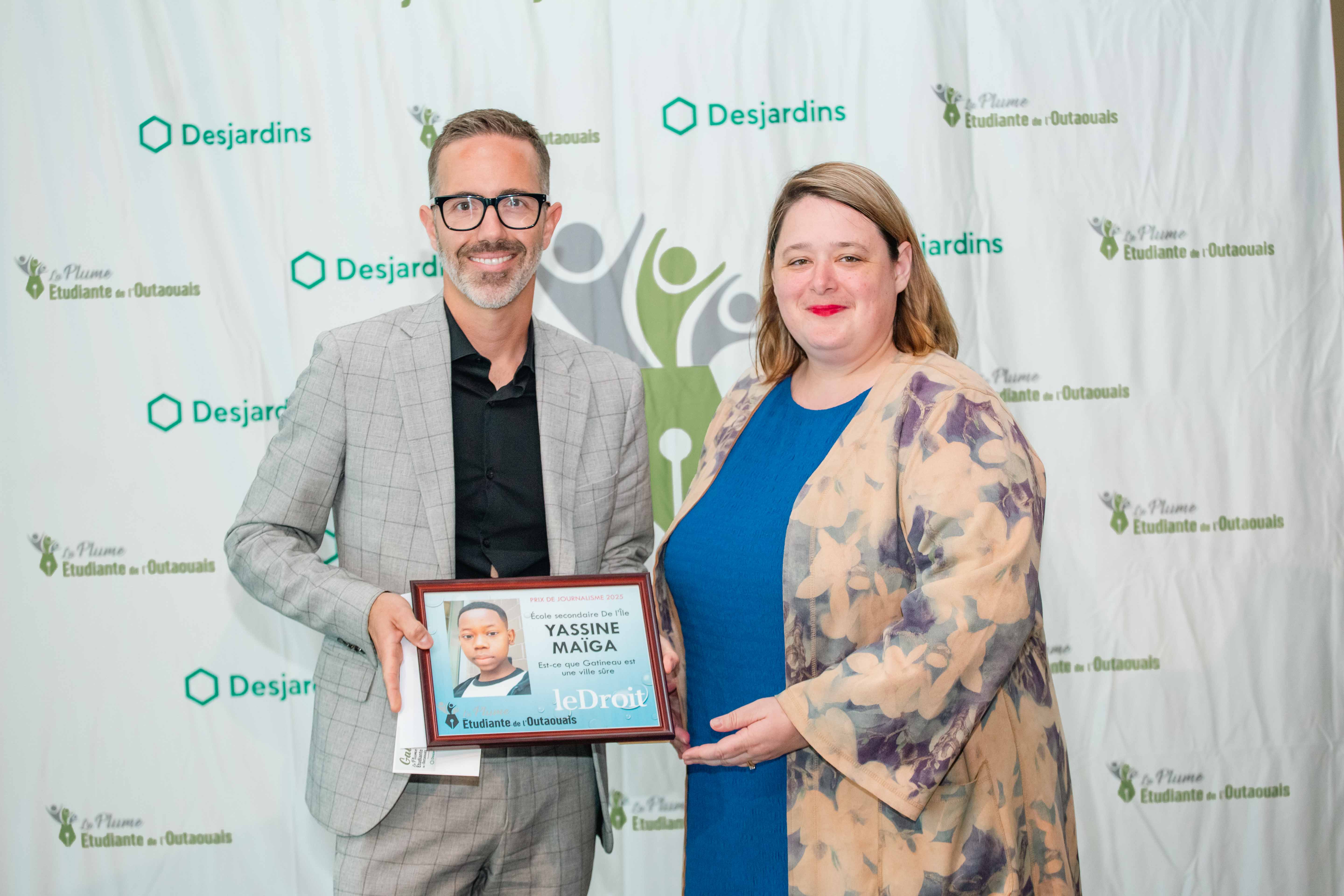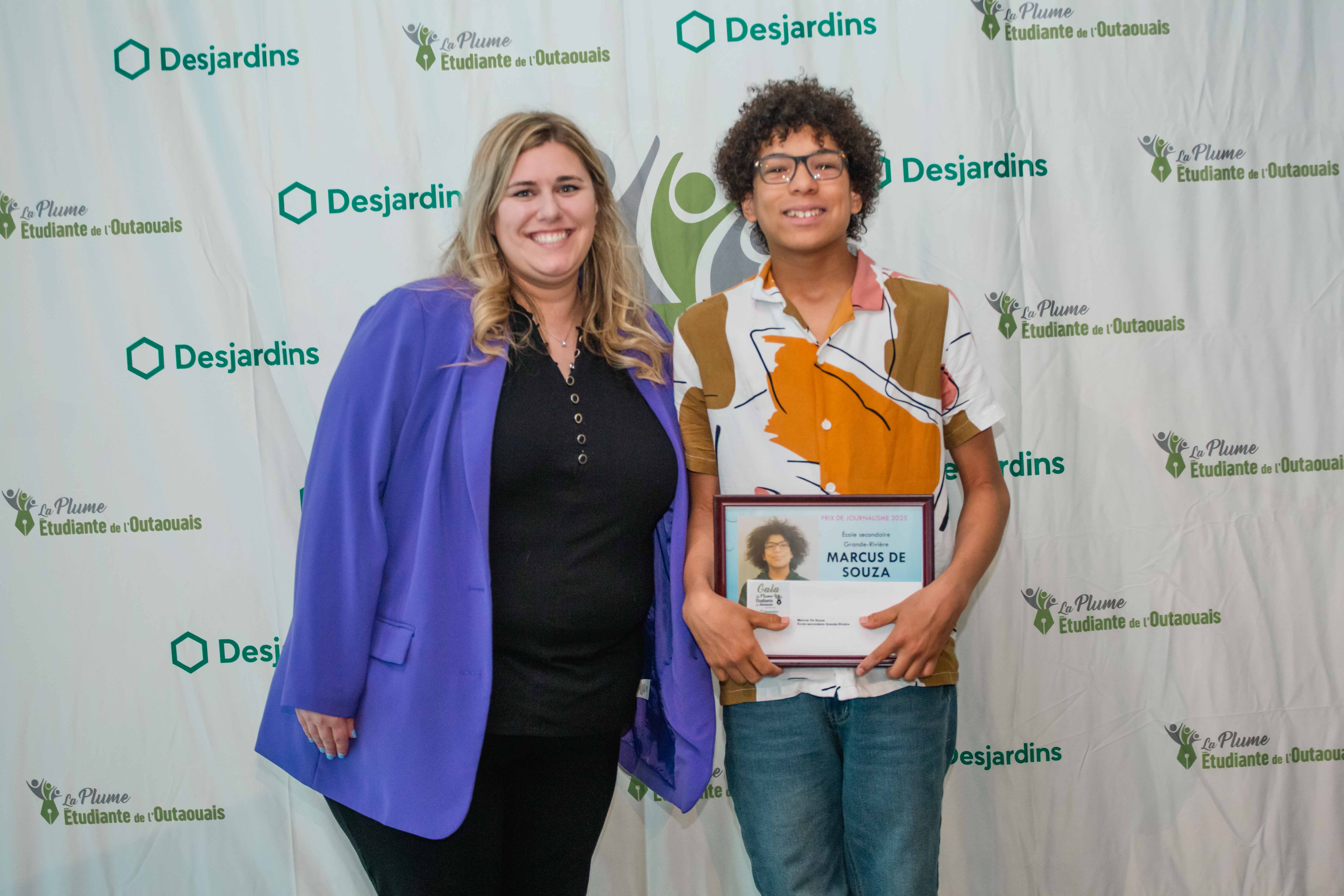 Le prix de journalisme à l’école secondaire Grande-Rivière a été décerné à Marcus De Souza. Prix remis par Audrey Lavoie, agente de liaison à La Cité.