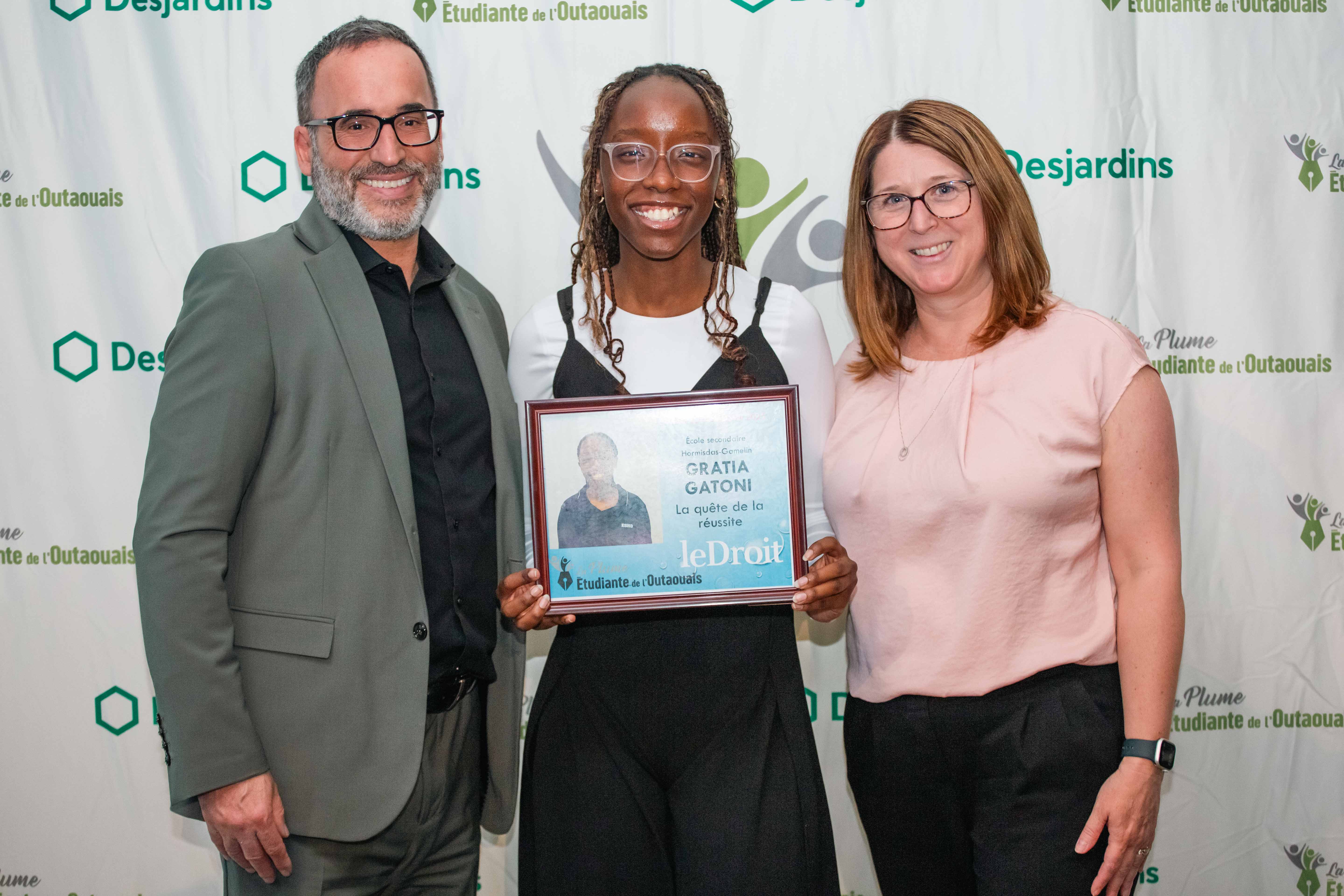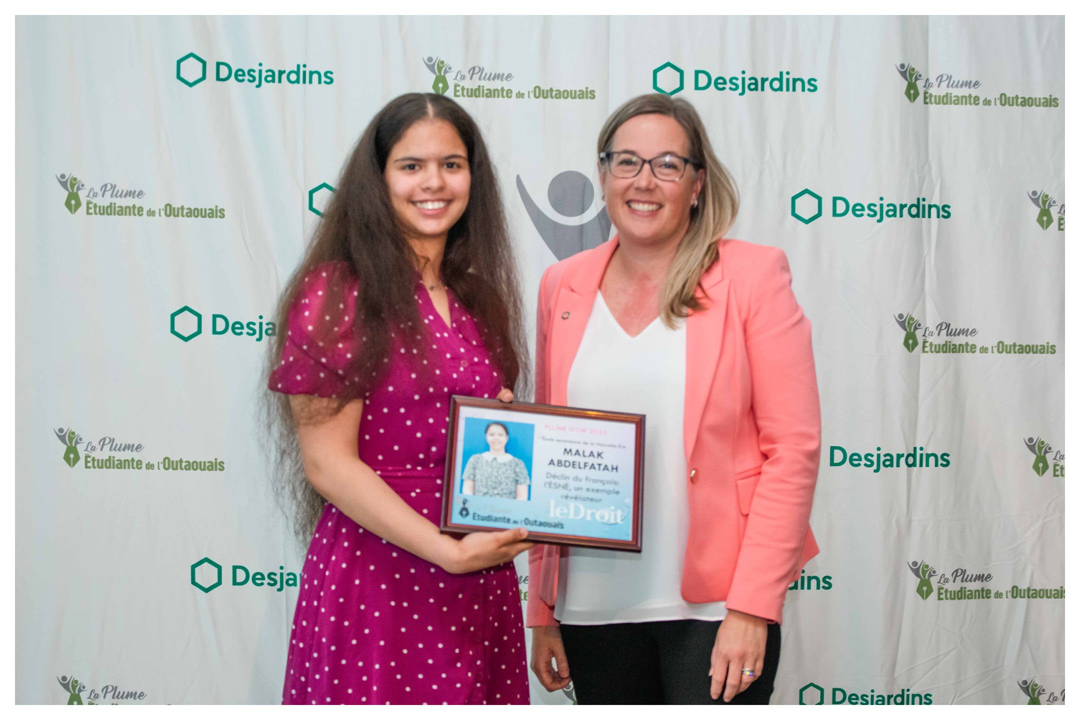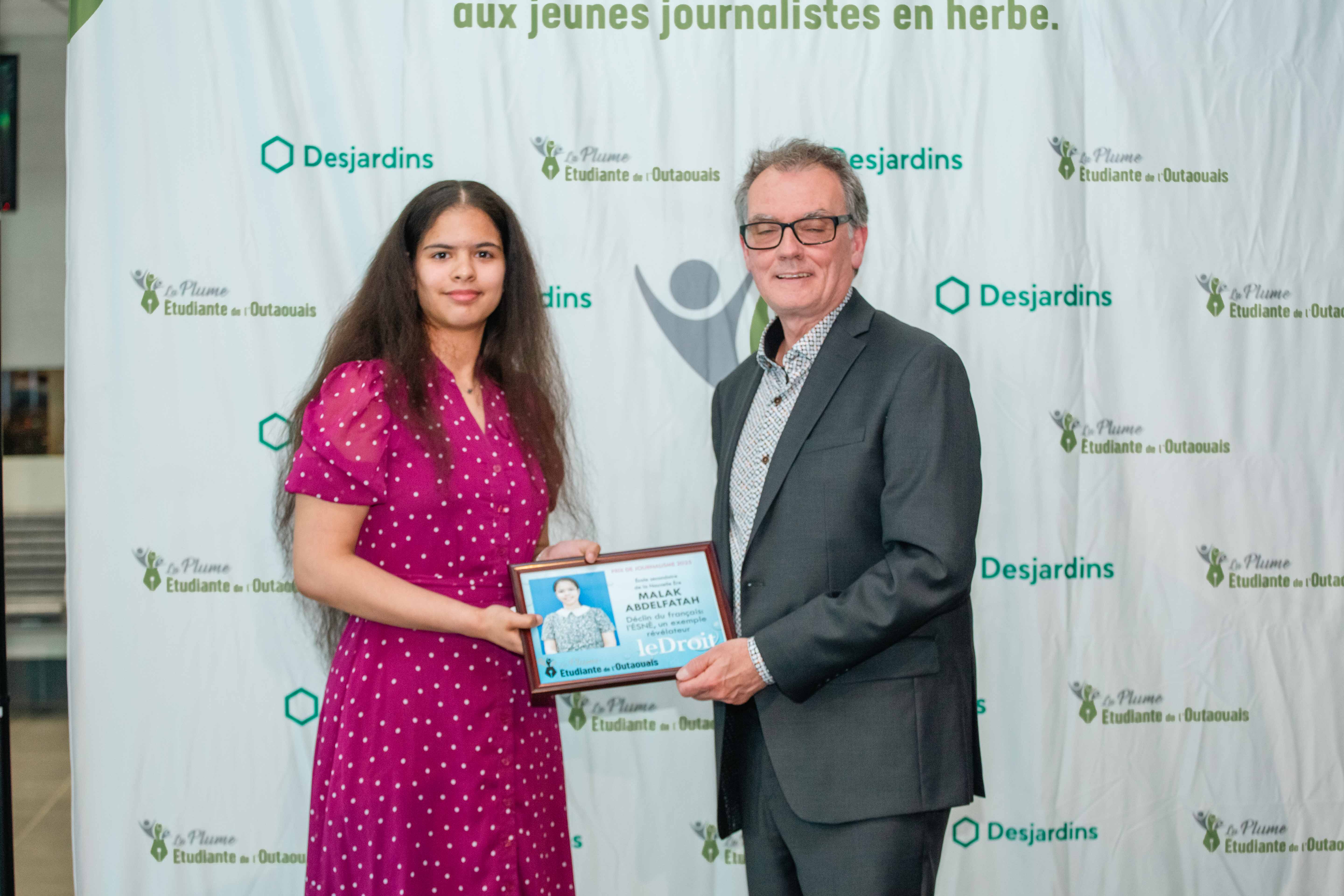 Le texte «Déclin du français: L’ÉSNÈ, en exemple révélateur» rédigé par Malak Abdelfatah, de l’école secondaire de la Nouvelle-Ère, a décroché la plus haute distinction du 23e Gala de La Plume Étudiante de l’Outaouais, soit la Plume d’Or. Son prix lui a été remis par Catherine Fraser, représentante des Caisses de l’Outaouais.