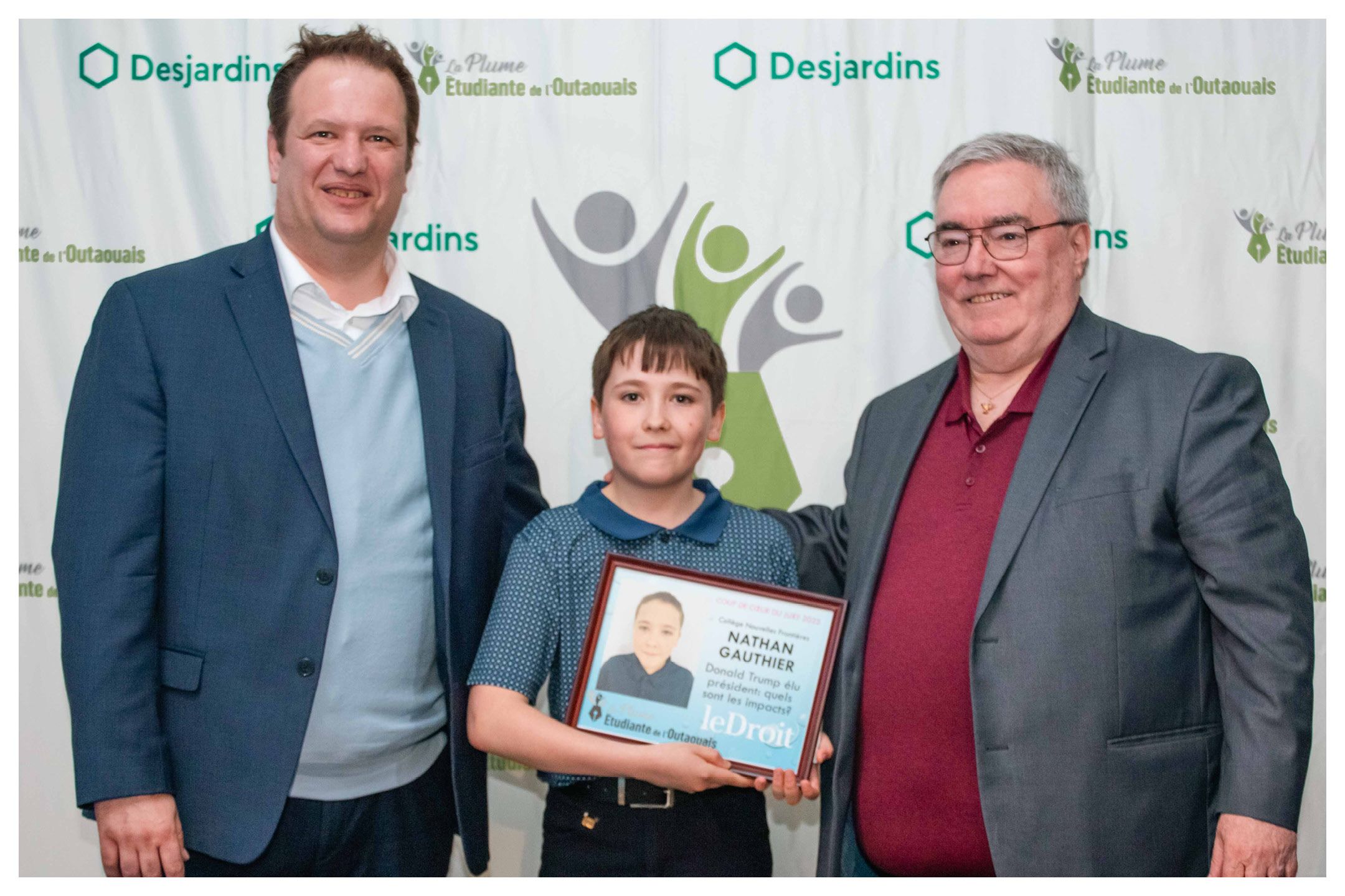 Nathan Gauthier a mérité le prix spécial du jury. Il est entouré du directeur général du journal Le Droit, François Carrier, et de son grand-père et ancien journaliste et gestionnaire au Droit, Michel Gauthier.