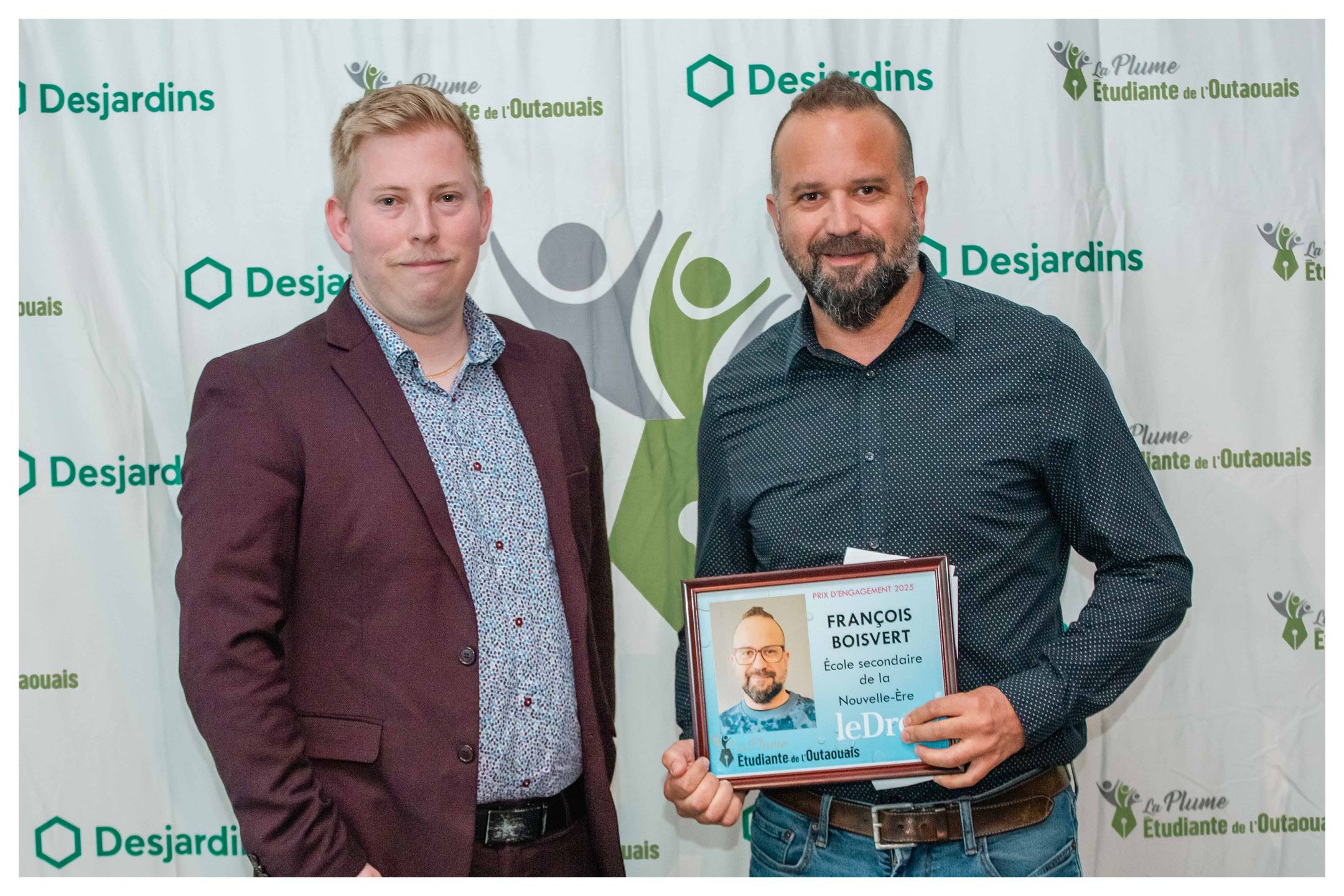 Cette année, le prix d’engagement a été remis à François Boisvert, enseignant à l’école secondaire de la Nouvelle-Ère. Grâce à son engagement, de nombreux élèves ont vécu l’expérience du journalisme. Ce qui a mené également à la production d’un journal pour l’école.