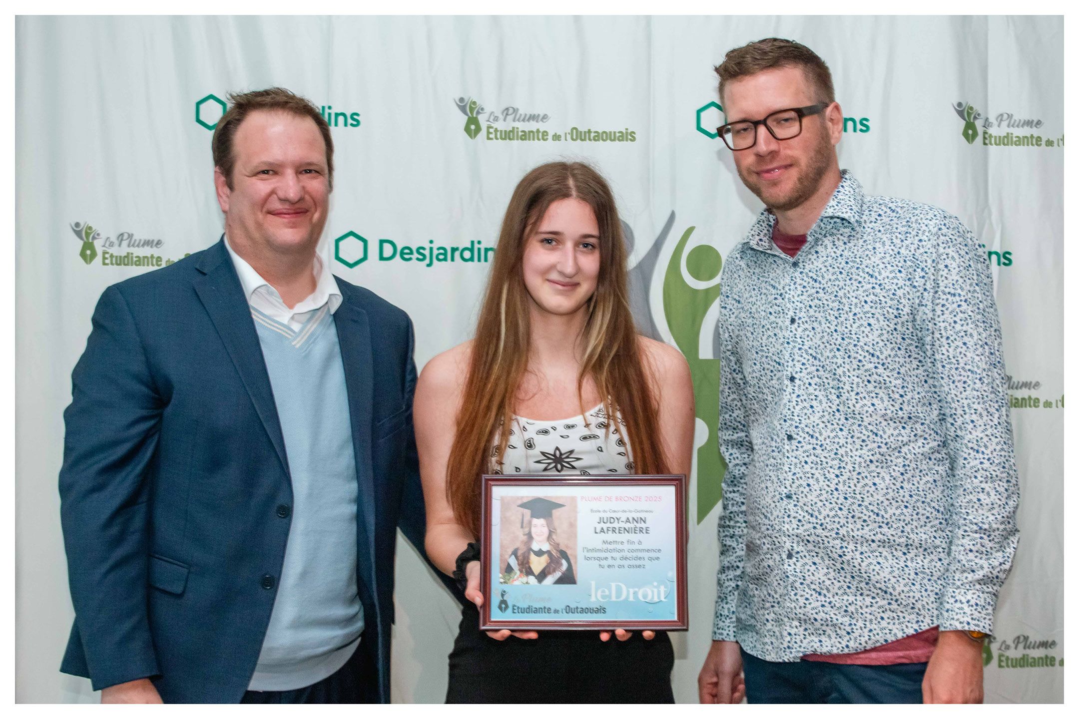 Pour son texte «Mettre fin à l’intimidation commence lorsque tu décides que tu en as assez», Judy-Ann Lafrenière, de l’école au Cœur-de-la-Gatineau à Gracefield, a décroché la Plume de Bronze représentant le 3e meilleur texte retenu par le jury de rédaction. Elle a reçu son prix des mains du directeur général du Droit, François Carrier.