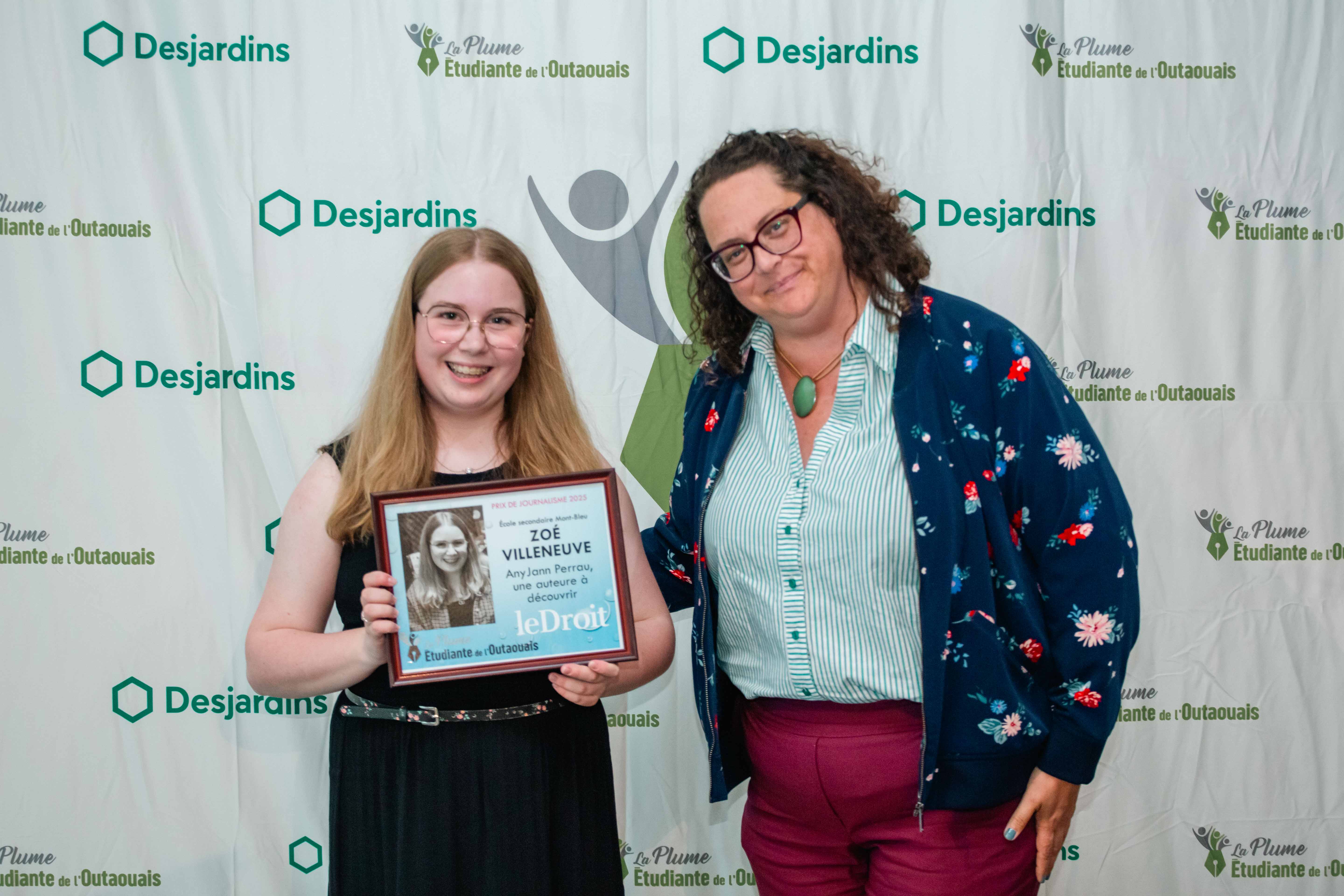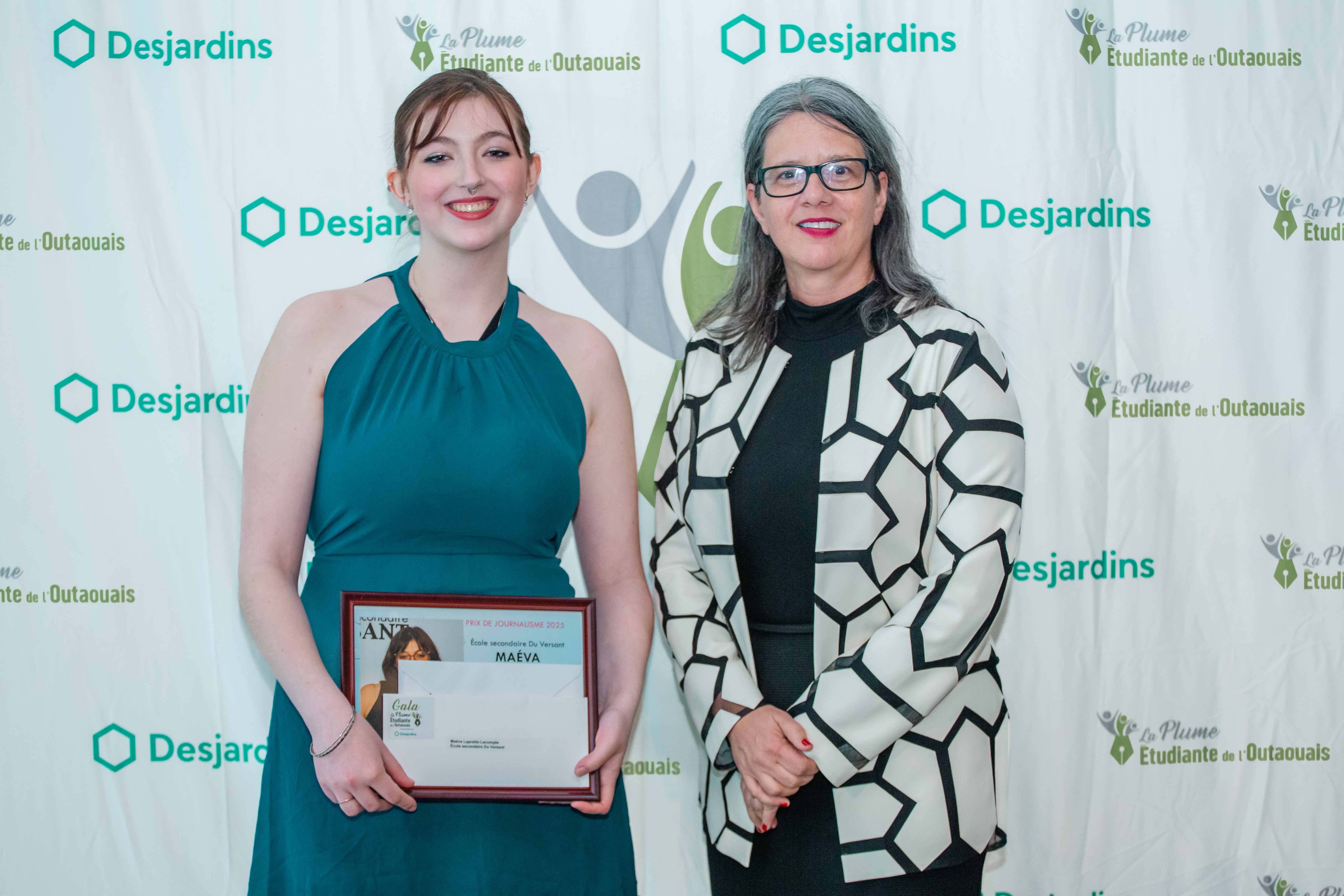 Maéva Lapratte-Lecompte, de l’école secondaire Du Versant, accepte son prix de journalisme des mains de Manon Dufour, directrice générale du Centre de services scolaire des Draveurs.