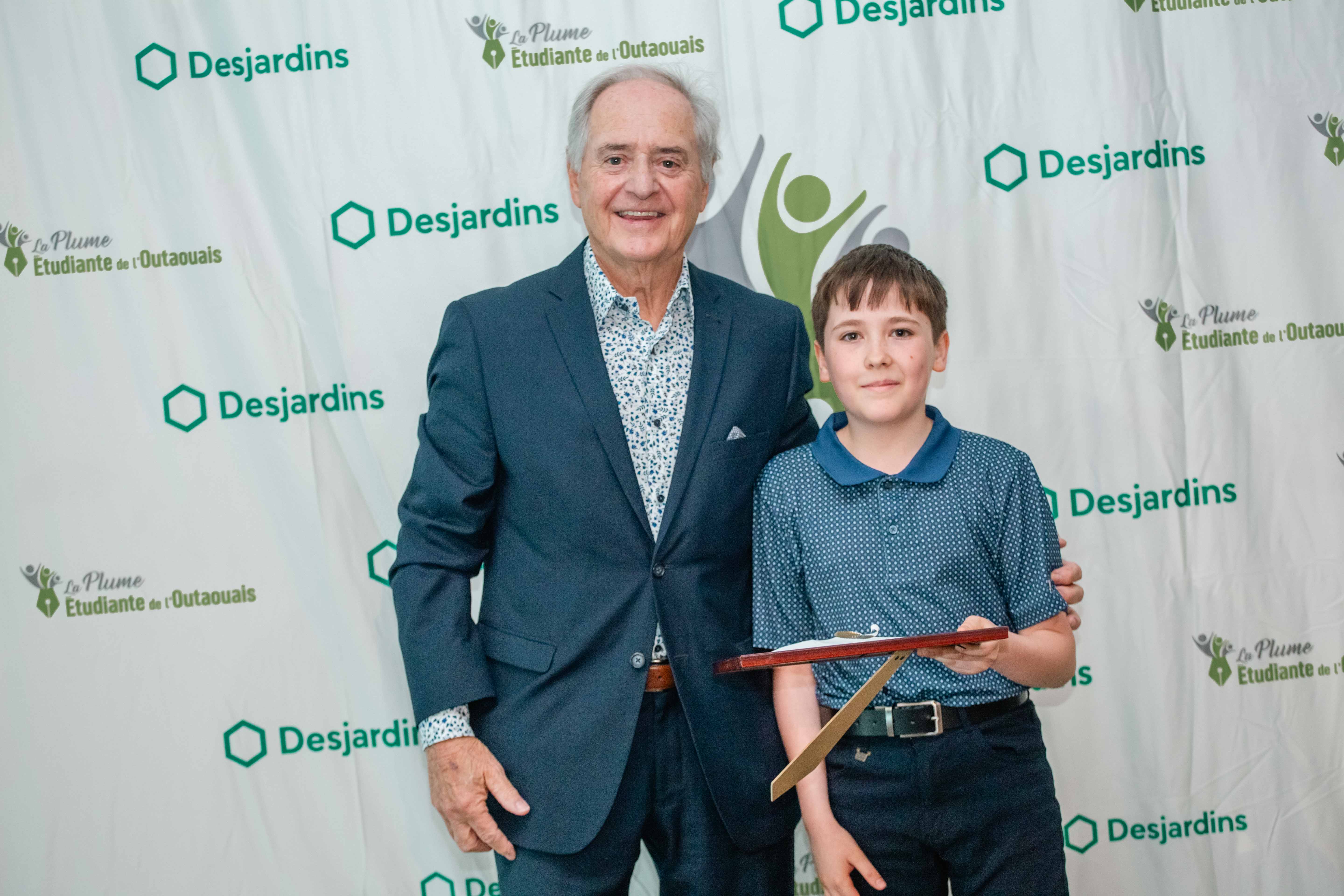 Le prix Spécial du Jury a été remis à Nathan Gauthier du Collège Nouvelles Frontières, par Claude Beaulieu, administrateur de la Plume de l’Outaouais, au nom du ministre et député de Papineau, Mathieu Lacombe, et du député de Gatineau, Robert Bussière.