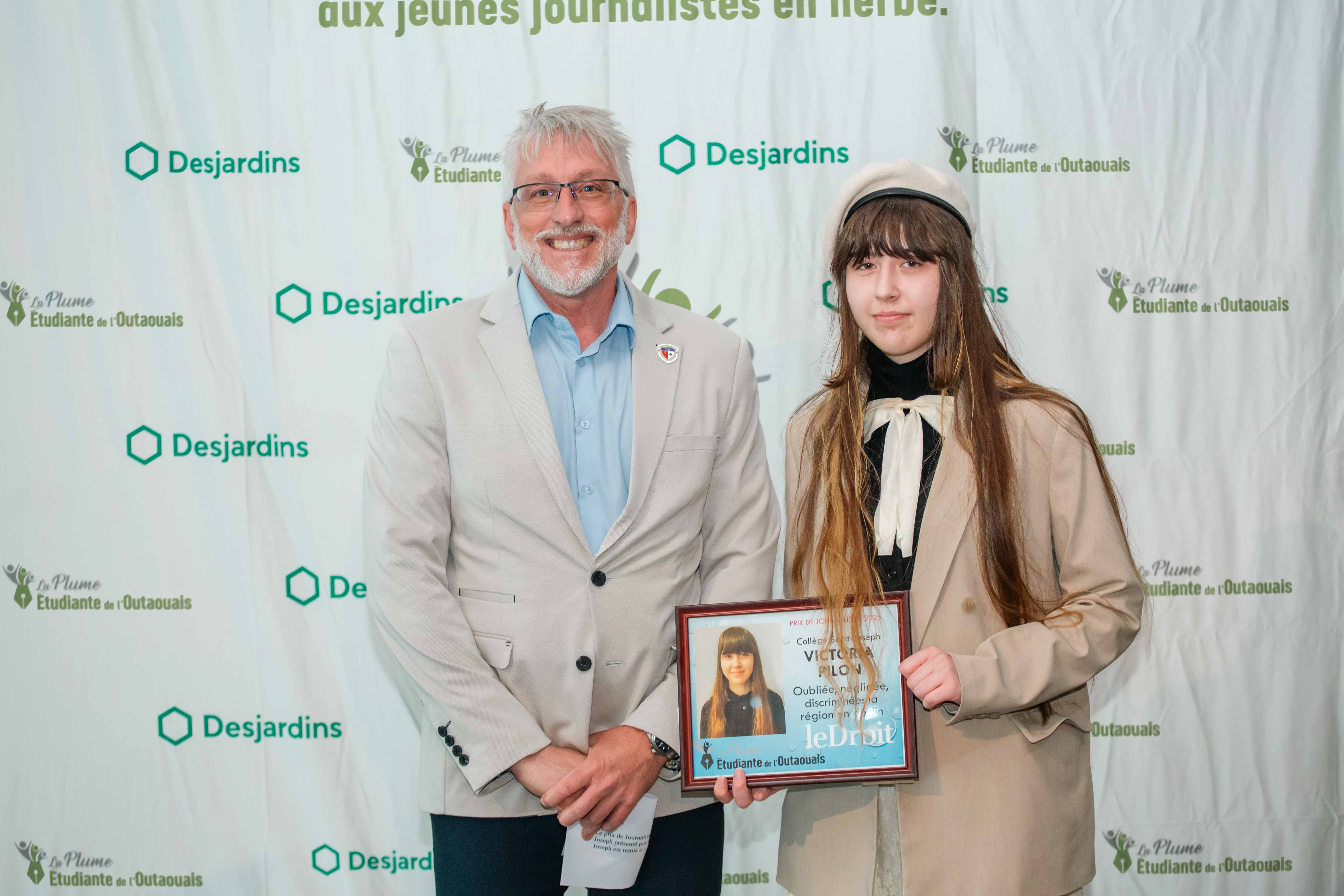 Le prix de journalisme du Collège Saint-Joseph a été remis à Victoria Pilon par le directeur général du Collège Saint-Joseph, Pierre Ménard.