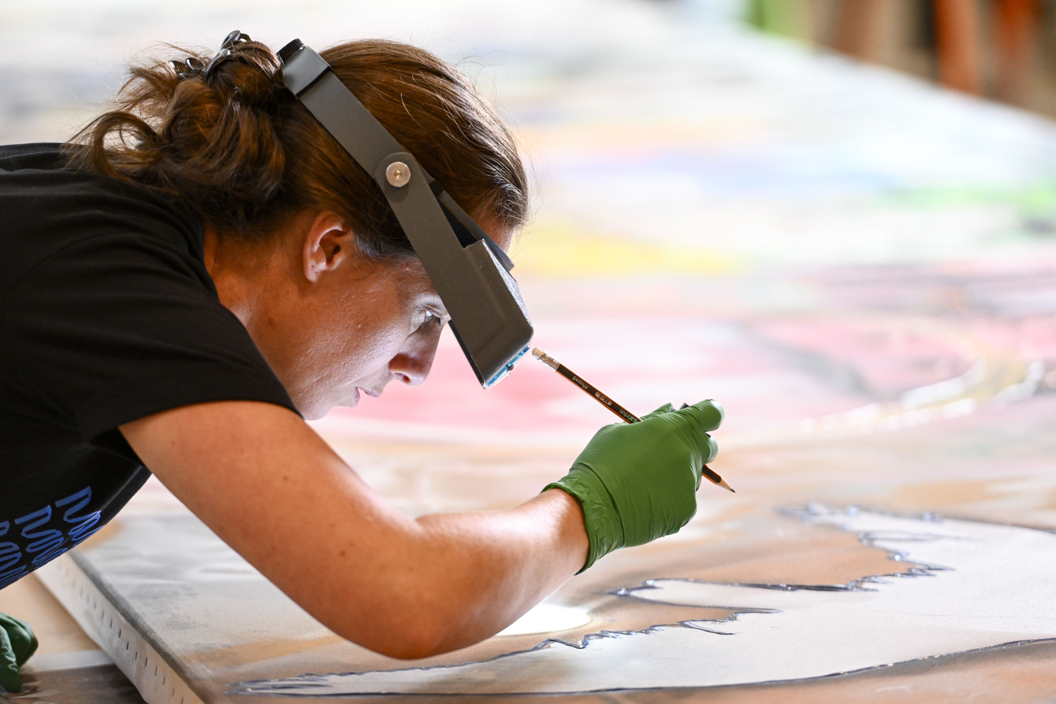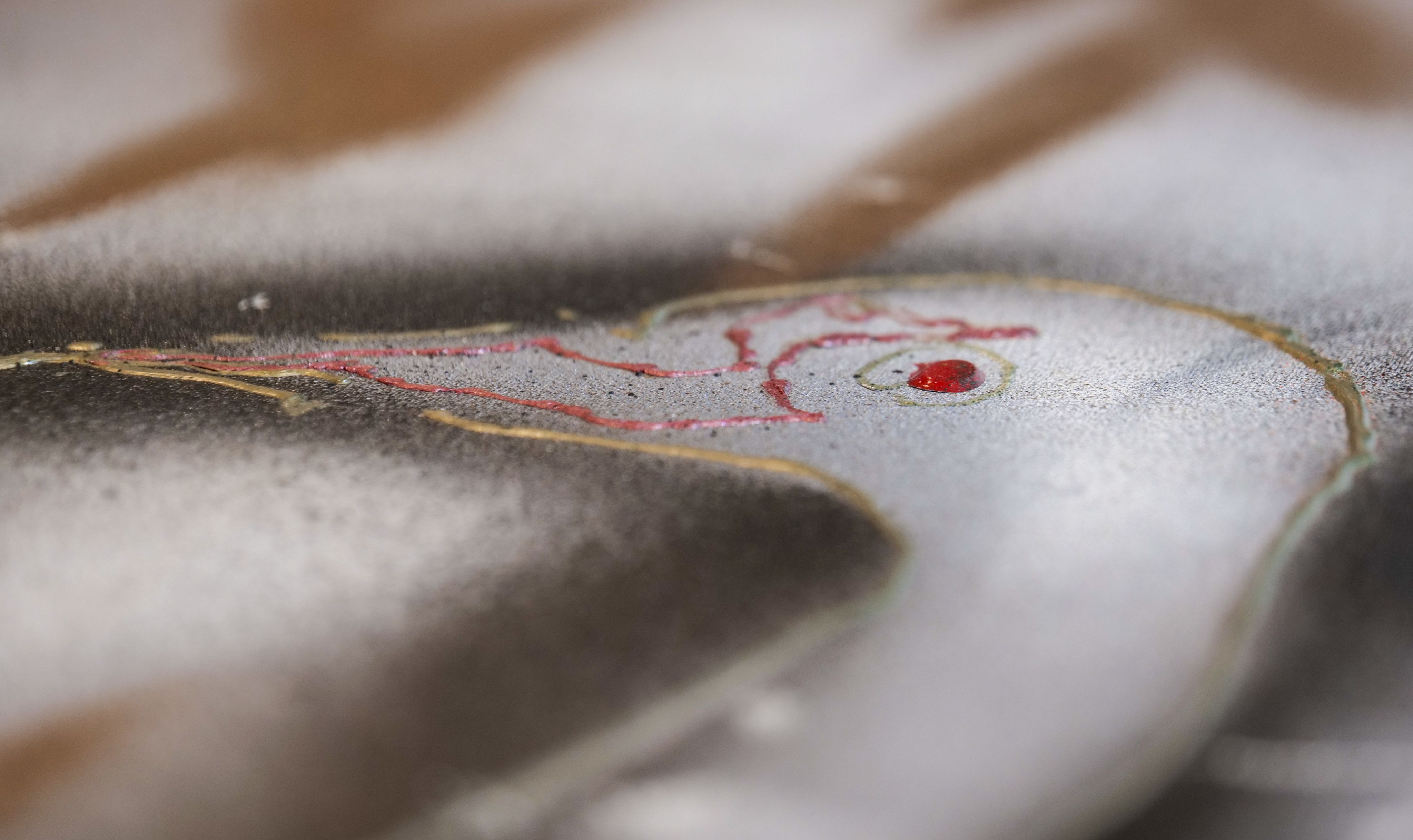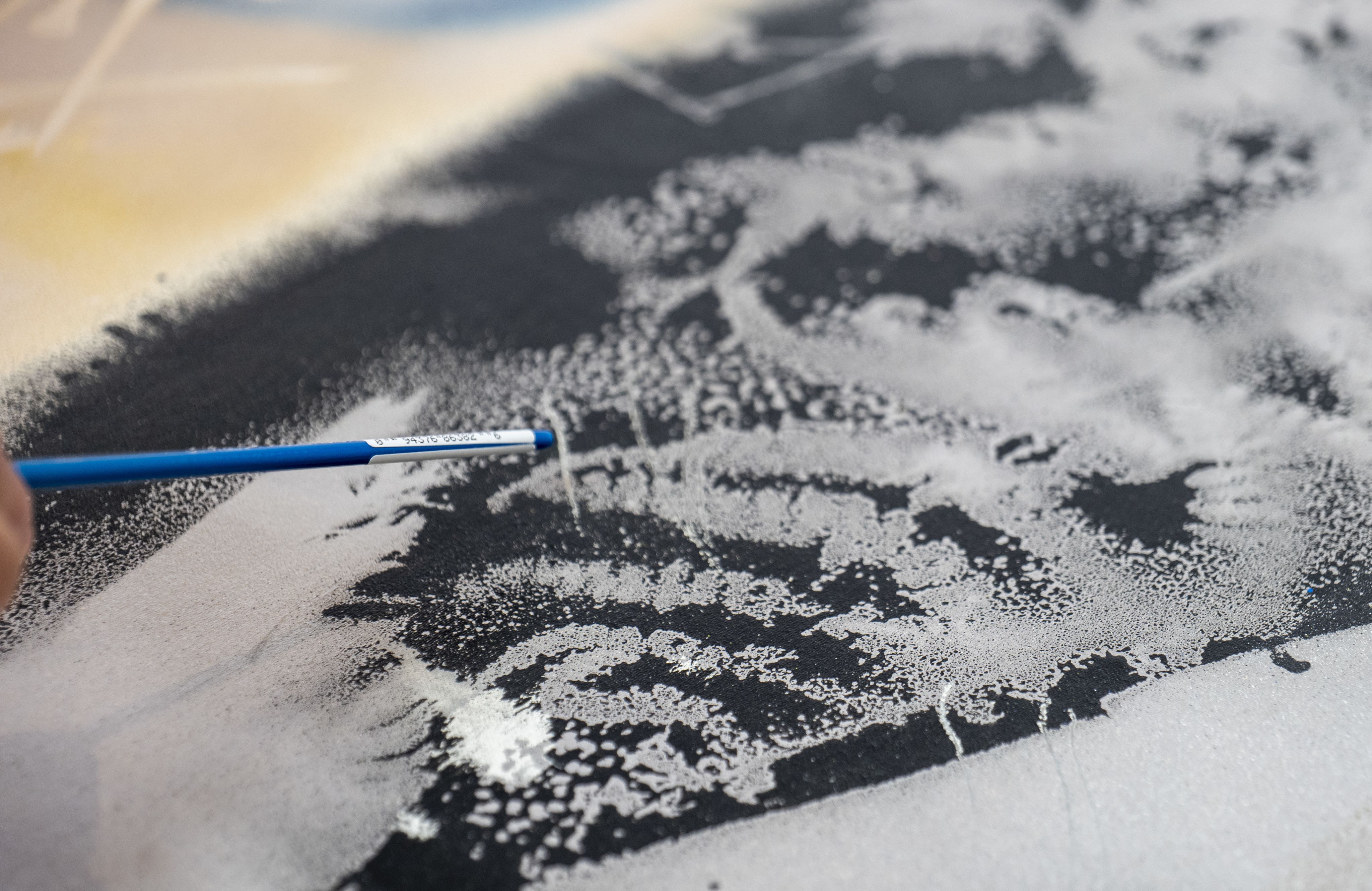«Ici, on voit que le noir a perlé en séchant. […] Il y a beaucoup de mélanges de matériaux qui semblent avoir une bonne compatibilité, mais dans certains cas on a des petits soulèvements [de la matière]», observe Mme Turcotte, qui se spécialise en peinture.