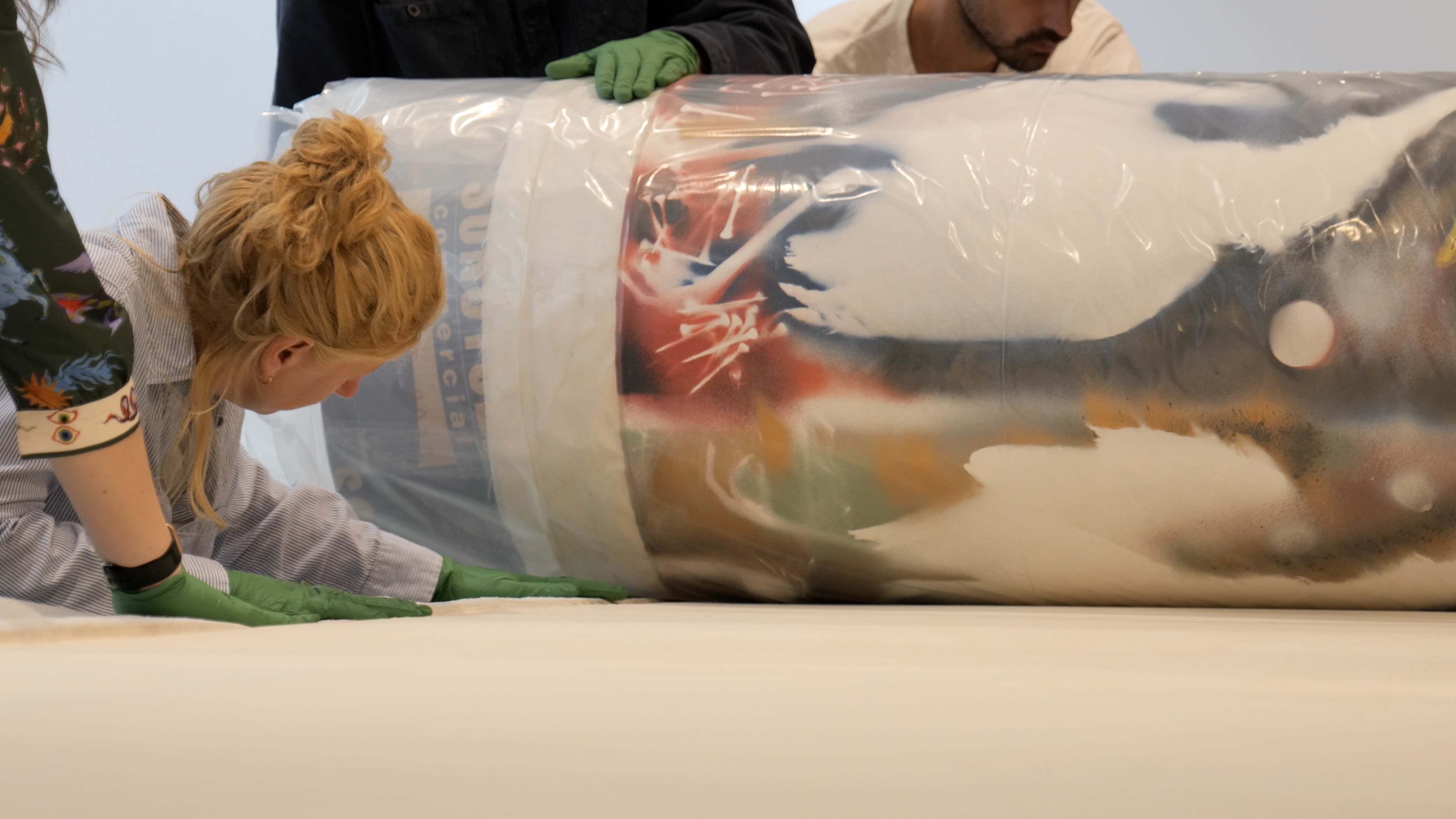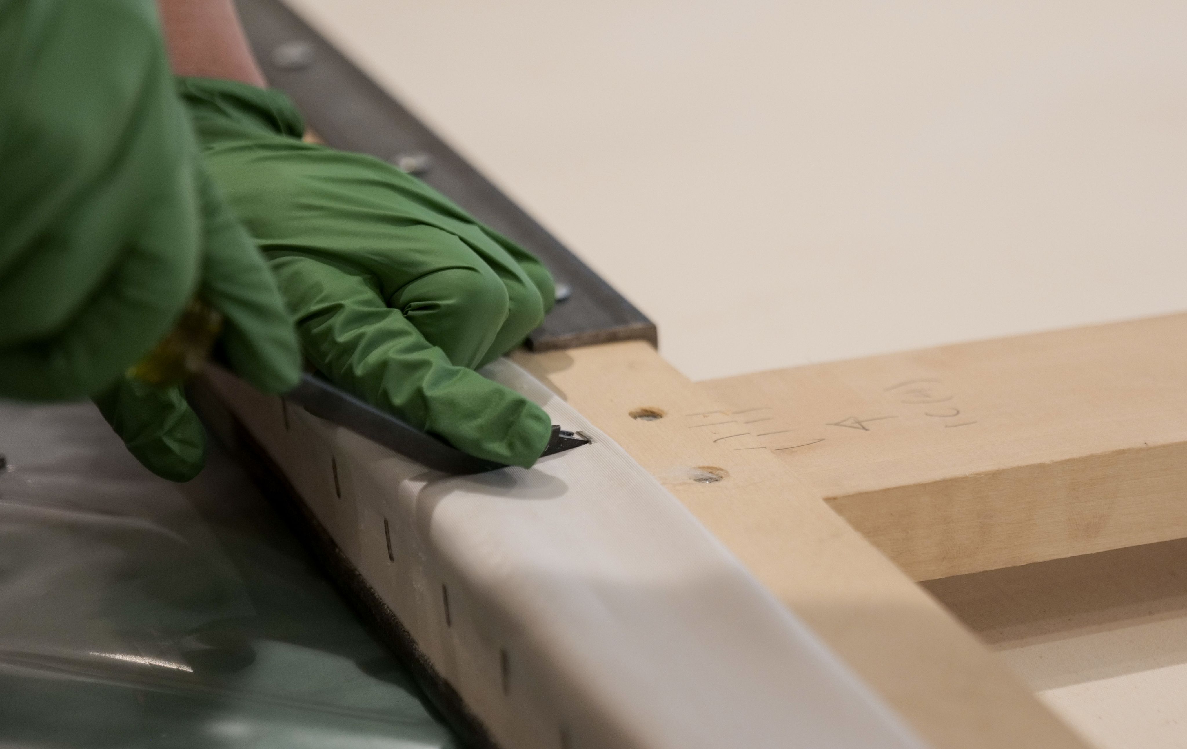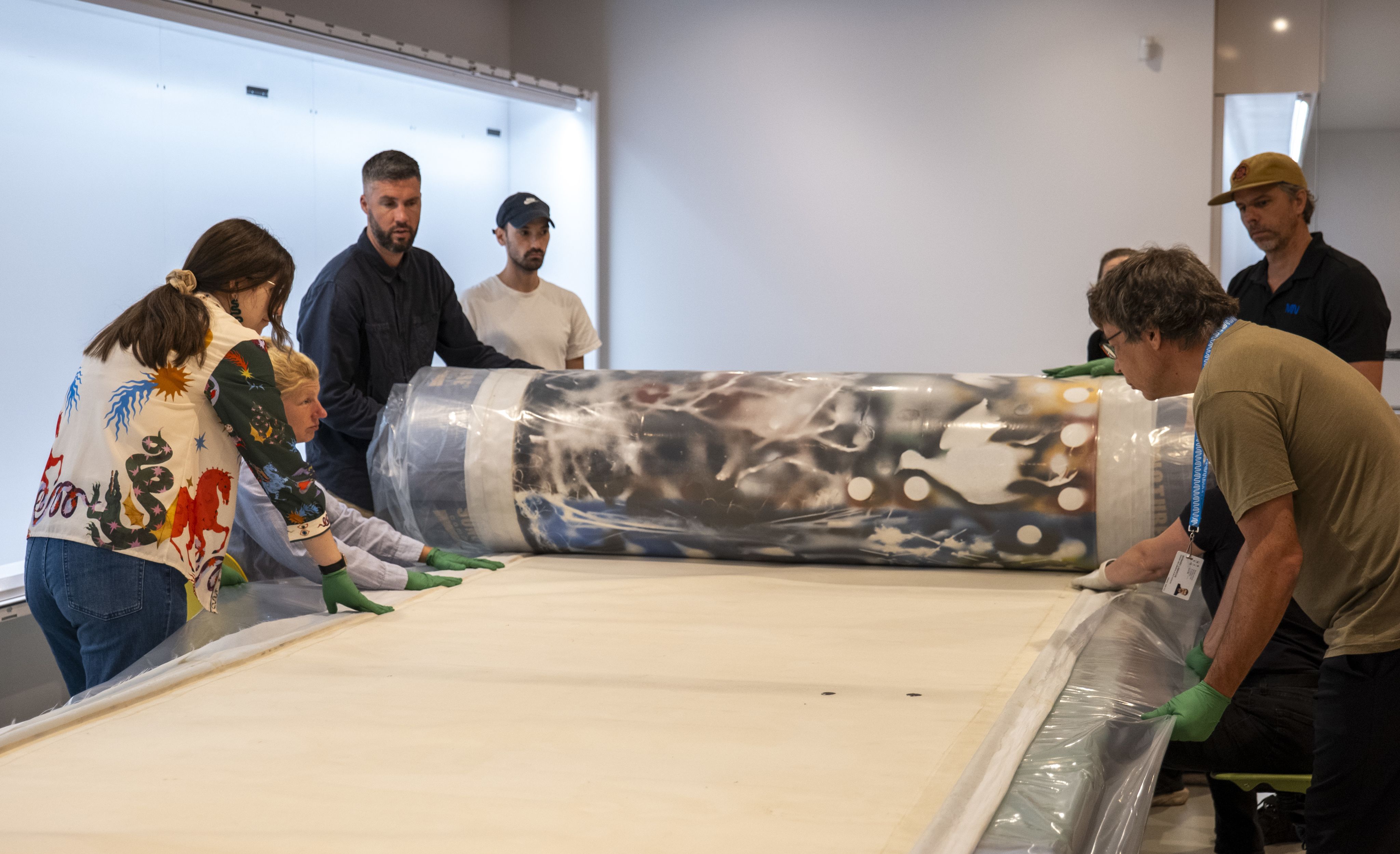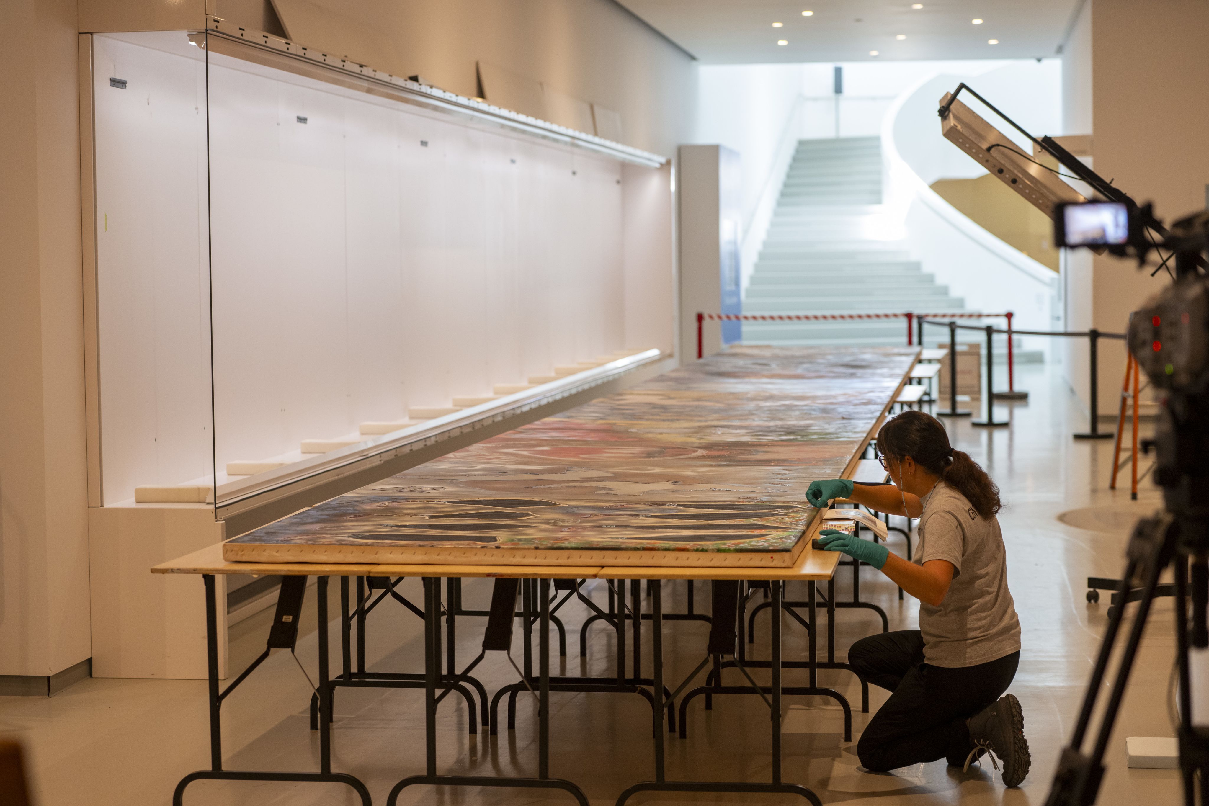 Après l’examen de son revers, la longue toile a par la suite été roulée et emballée afin d’être conservée jusqu’à son installation dans le nouveau pavillon du MNBAQ.