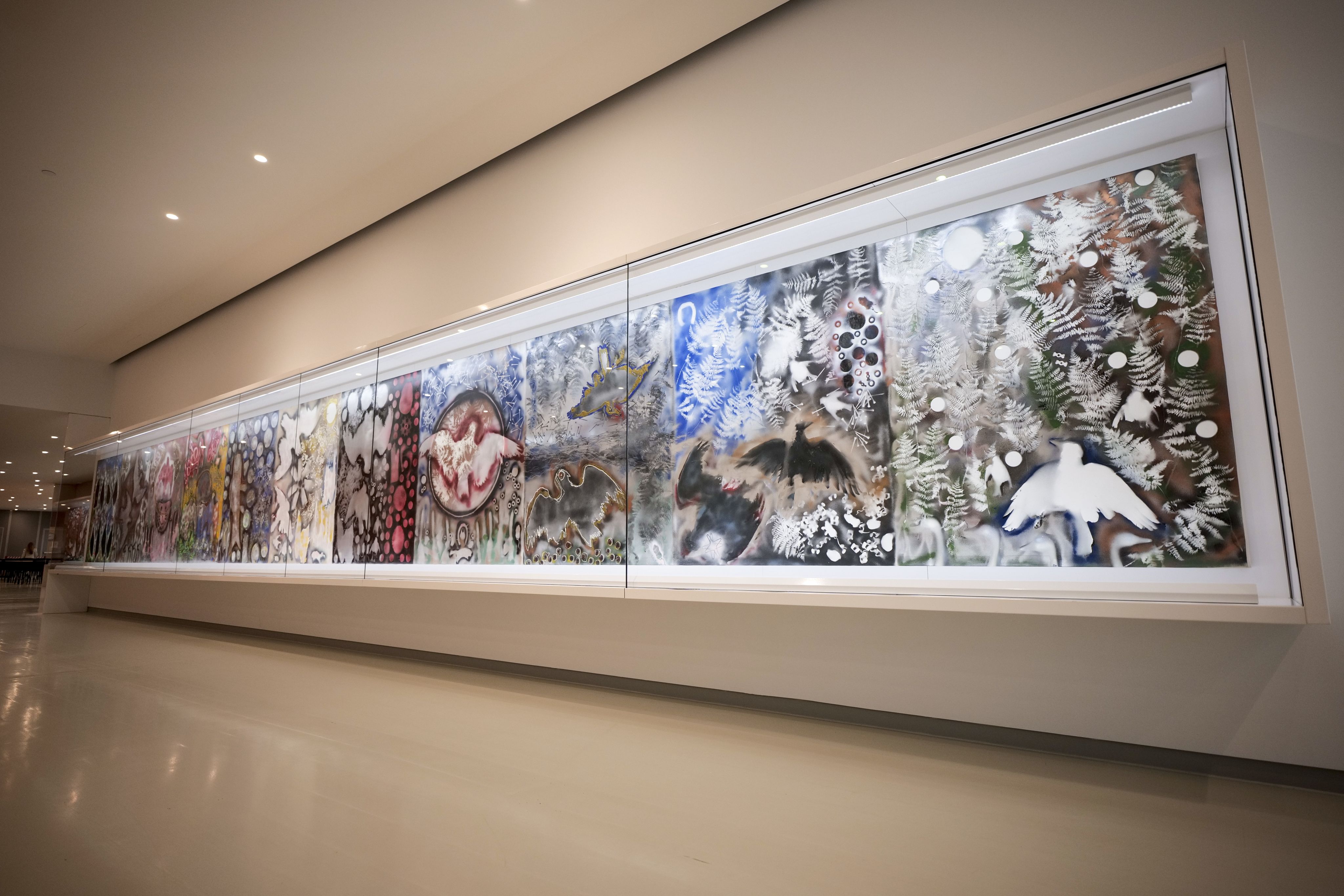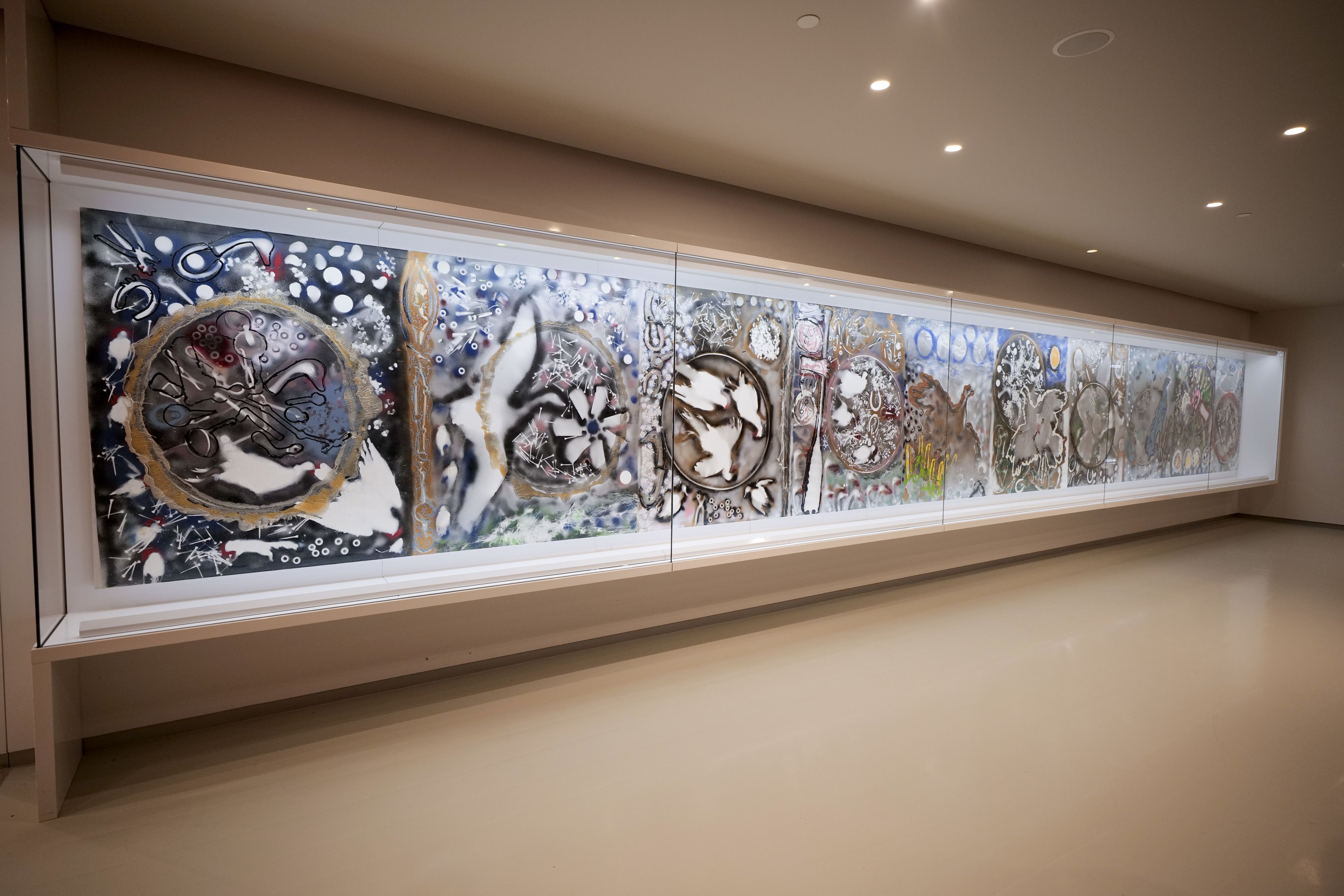À travers les 40 mètres de toile, on remarque une trentaine de «tableaux». Il s’agit, en fait, de la forme rectangulaire de la table où Riopelle peignait.