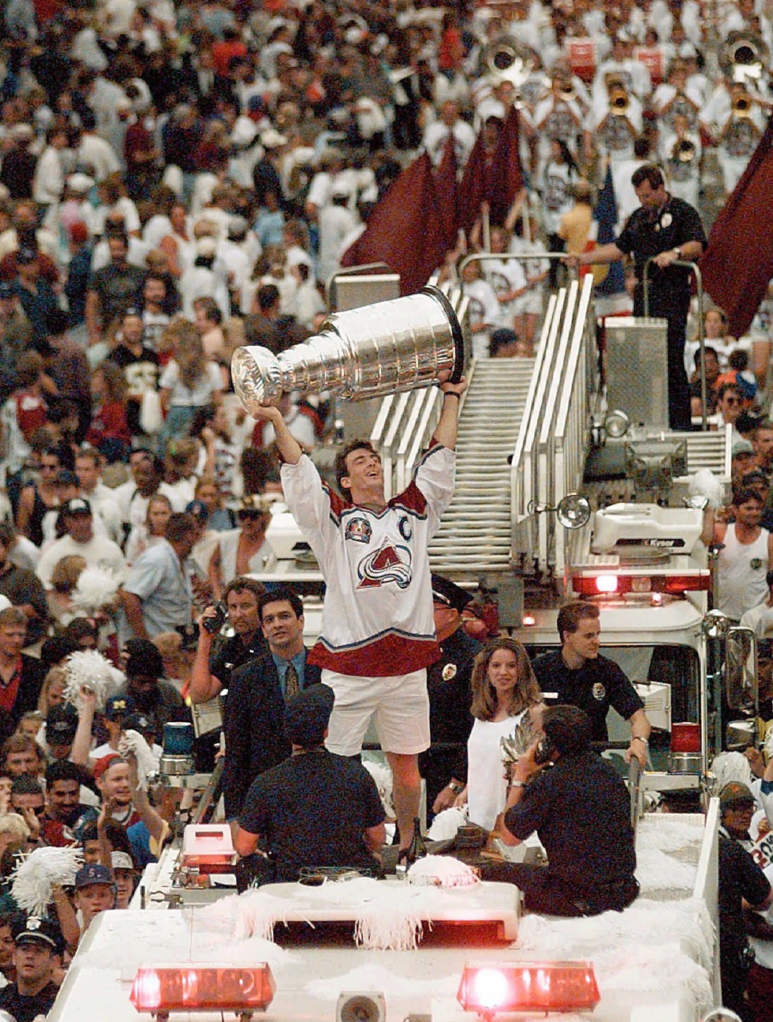 Le capitaine de l’Avalanche, Joe Sakic, a soulevé sa première coupe Stanley le 10 mai 1996. Le défilé dans les rues a attiré 100 000 personnes dans les rues de Denver. (Photo AP Joe Mahoney)
