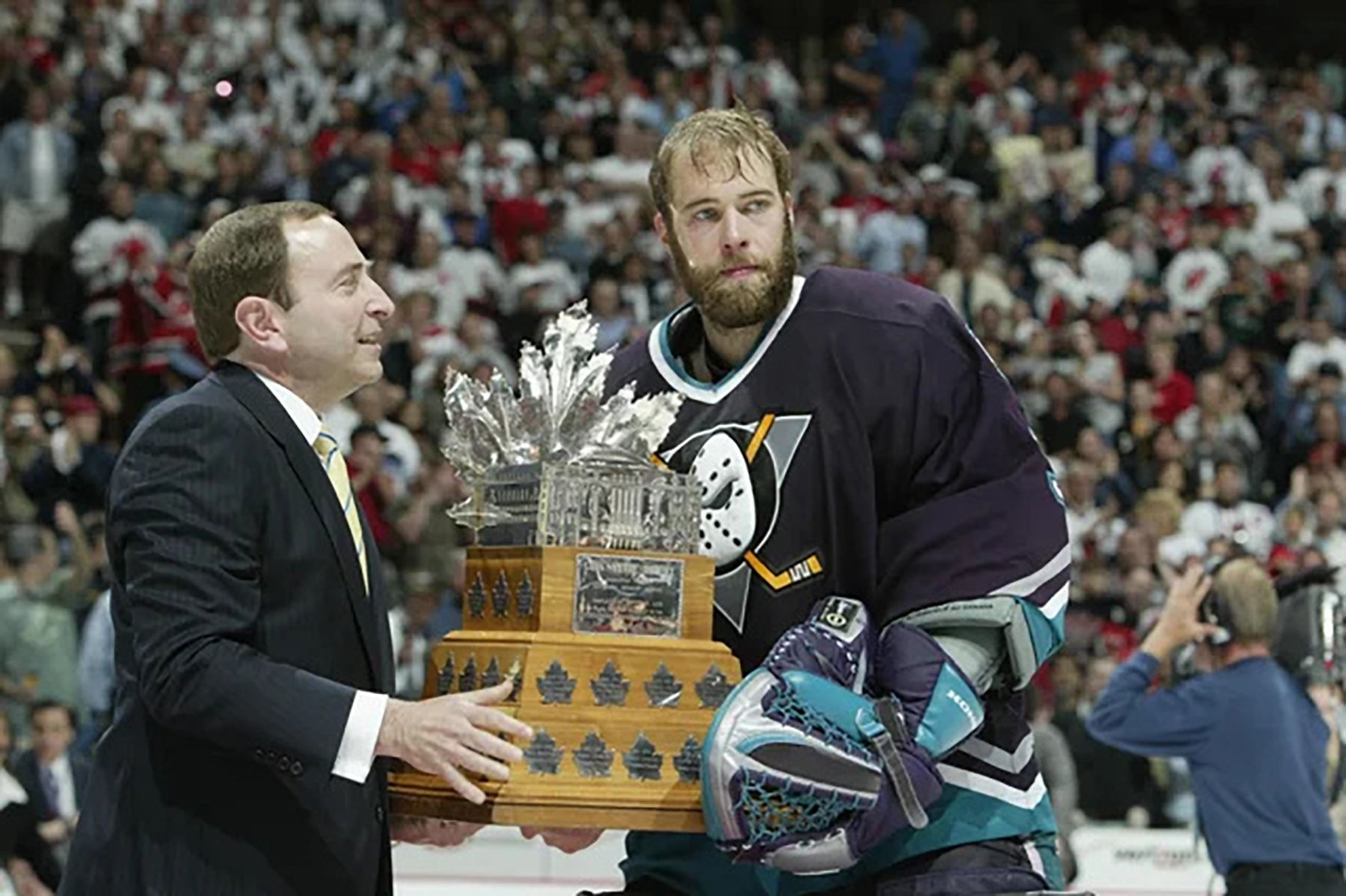 Quand Jean-François Damphousse est arrivé chez les Mighty Ducks, ceux-ci étaient déjà bien armés devant le filet. Jean-Sébastien Giguère allait d’ailleurs mener Anaheim à la finale de la Coupe Stanley quelques mois plus tard, ce qui allait lui valoir le trophée Conn-Smythe malgré la défaite des siens. (Photo Reuters)