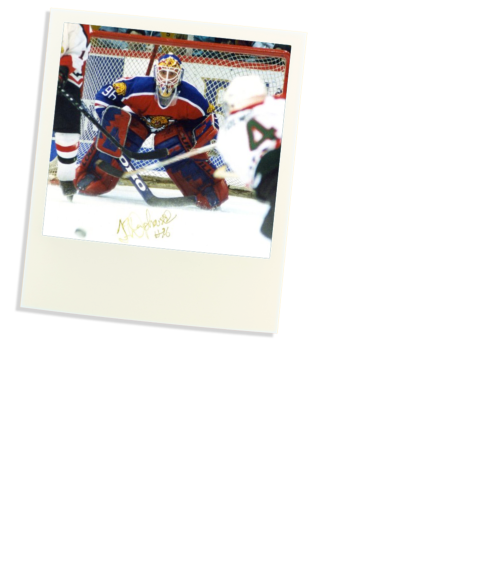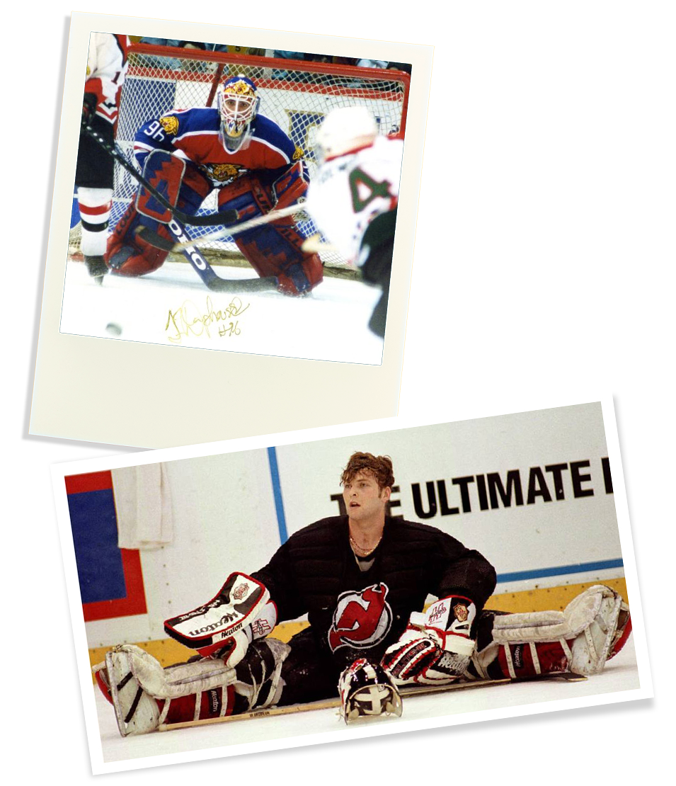 Photo 1: Avant de faire le saut dans les rangs professionnels, Jean-François Damphousse a pris son envol chez les Wildcats de Moncton. Signe des liens puissants qu’il a développés au Nouveau-Brunswick, Damphousse est encore un résident de cette province. (Photo Ligue canadienne de hockey). - Photo 2: À l’époque où Damphousse a été repêché par le New Jersey, Martin Brodeur en était à ses premières dans la LNH et il était déjà un gardien de premier plan.