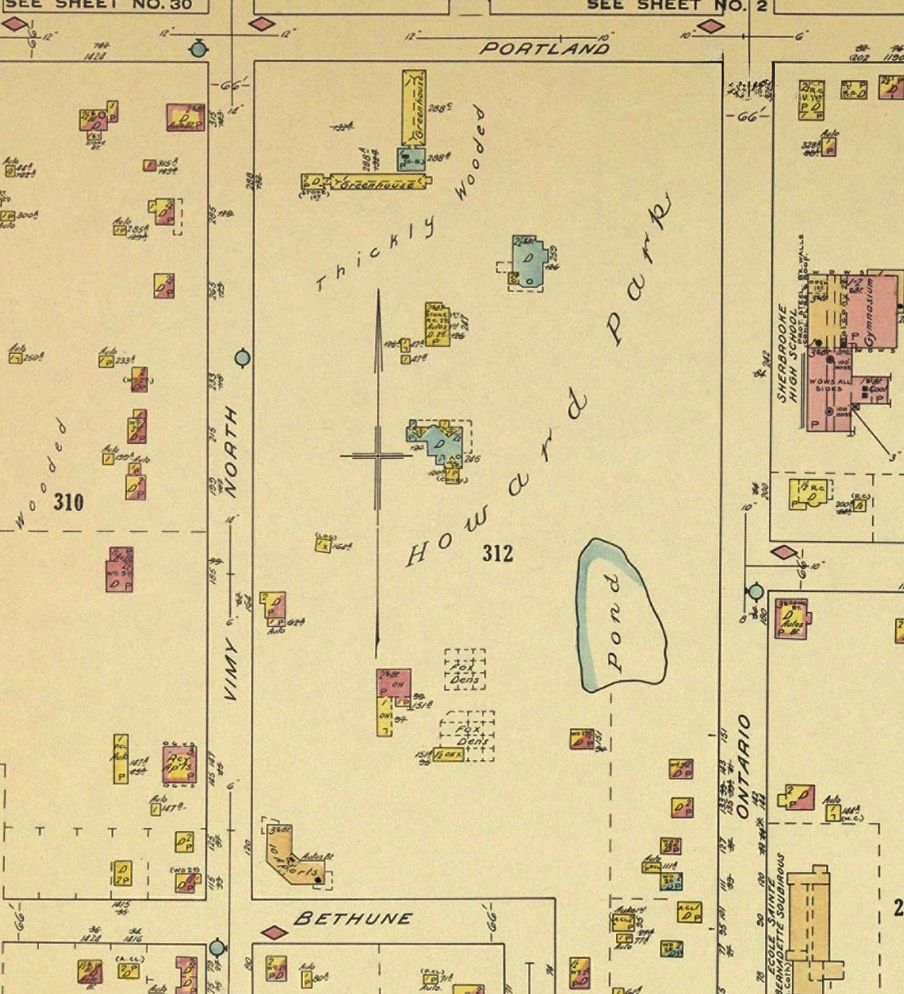 L’étang du Domaine-Howard est bien visible sur les plans de la ville au milieu du 20e siècle. (Photo Sherbrooke Insurance Plan, en 1953, Musée d’histoire de Sherbrooke)