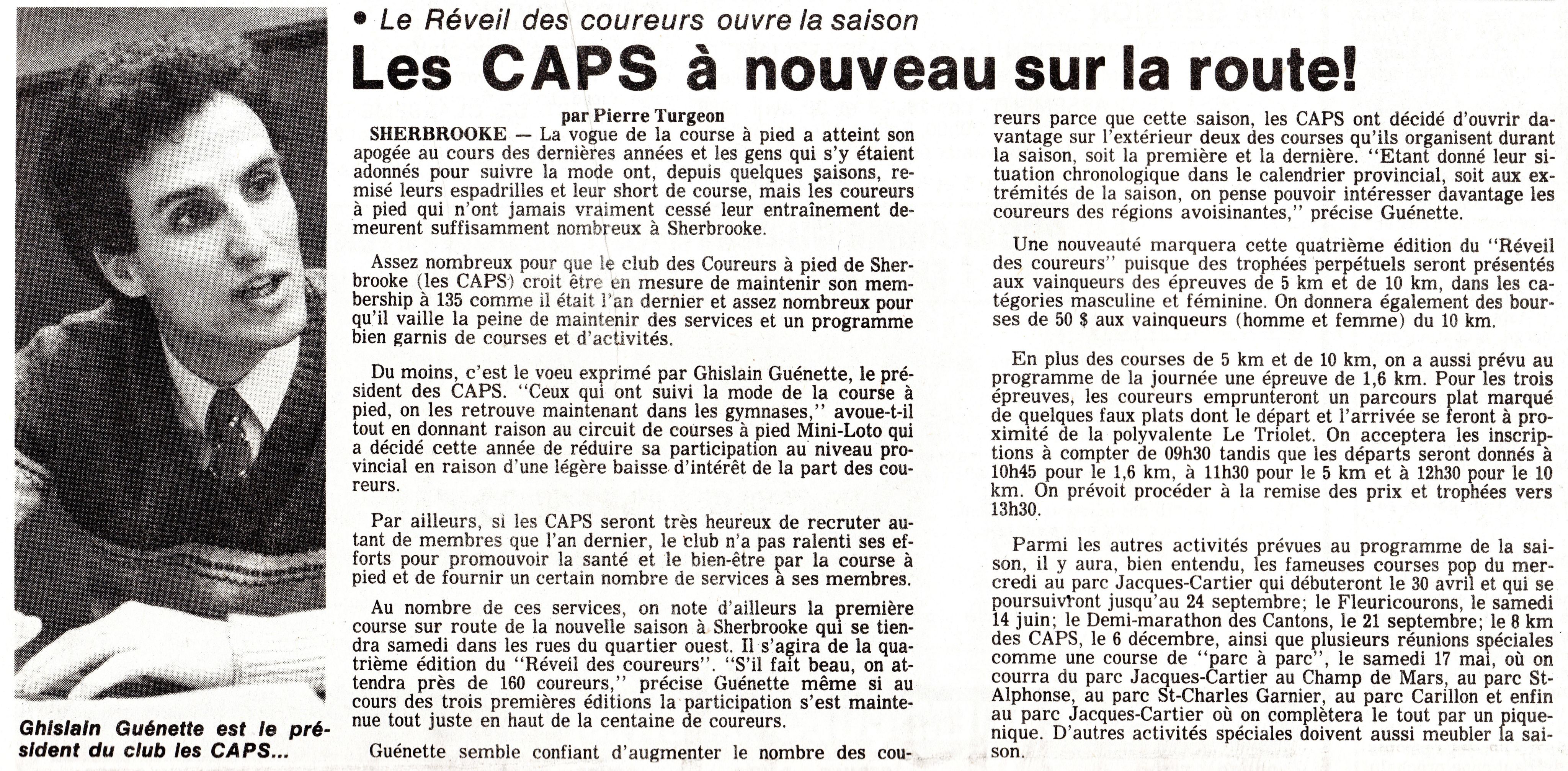 Le CAPS - Coureurs à pied de Sherbrooke - est un club né en avril 1974. Il compte près de 135 membres une décennie plus tard, et certaines des courses régulières qu’ils organisent affichent plus de 160 personnes à la ligne de départ! (Photo La Tribune, 23 avril 1986)