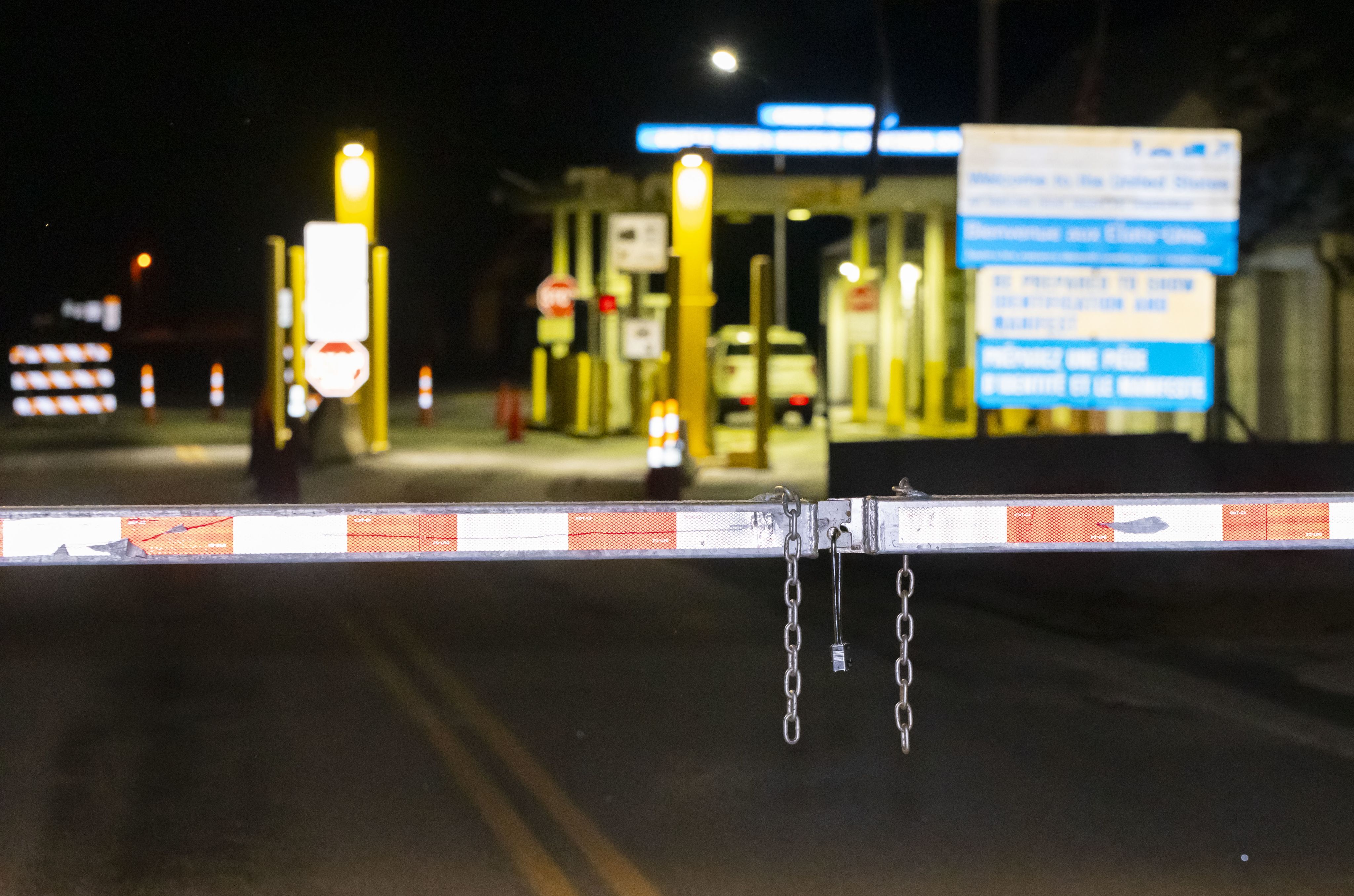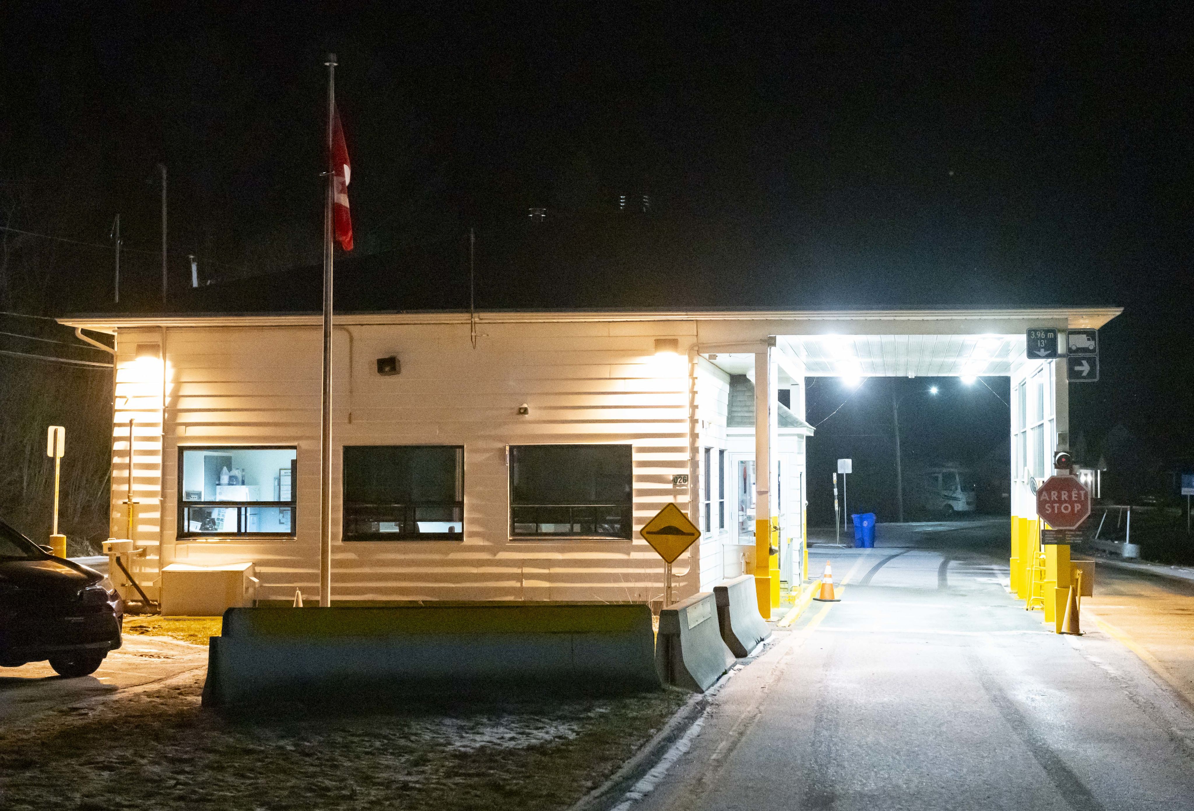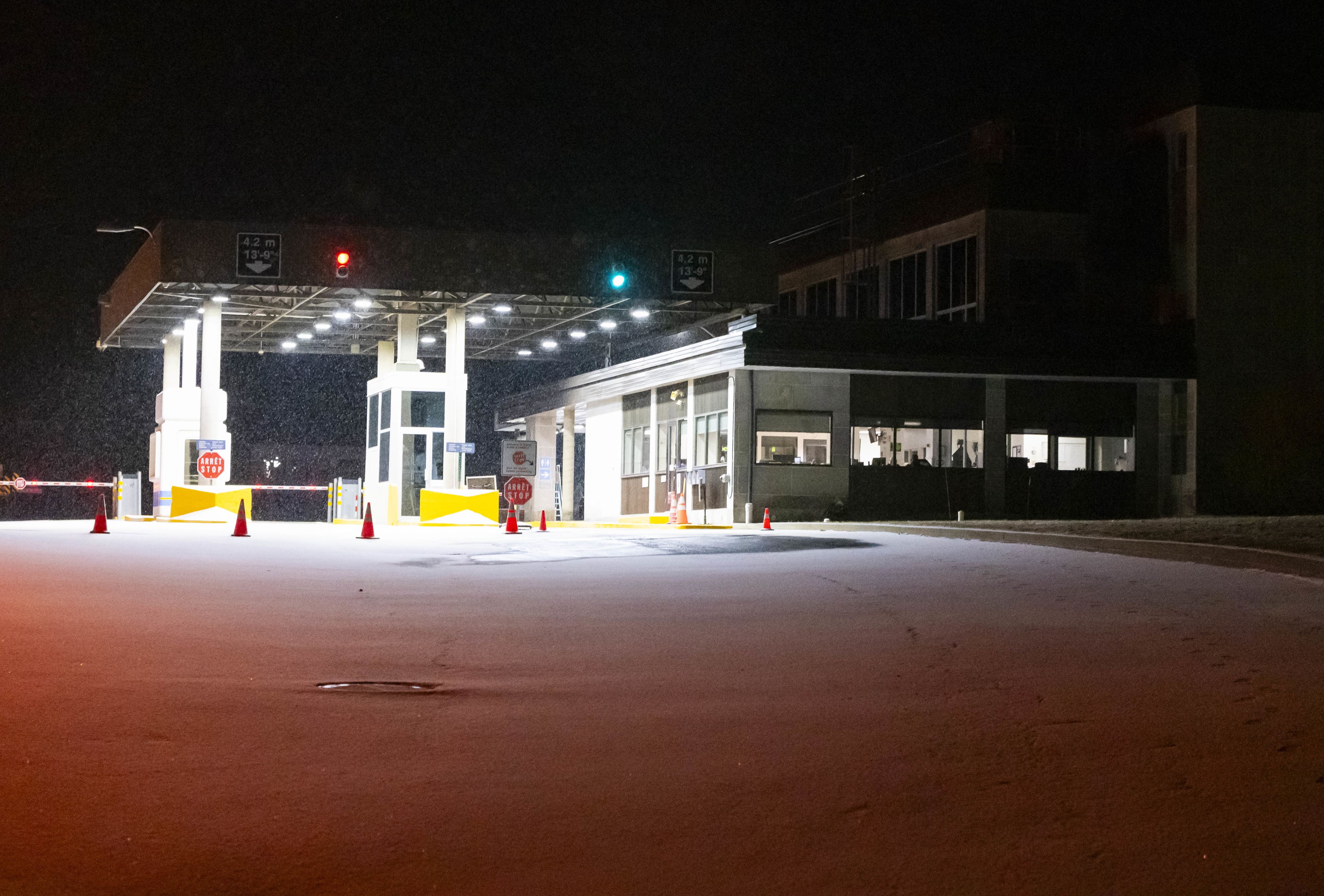 Un mercredi soir, 21h, toujours en mars. Cette fois, nous approchons le poste frontalier de Hereford en Estrie, qui ferme chaque soir à 20h. Le bâtiment est allumé, mais désert. Les caméras de l’Agence des services frontaliers du Canada nous observent.