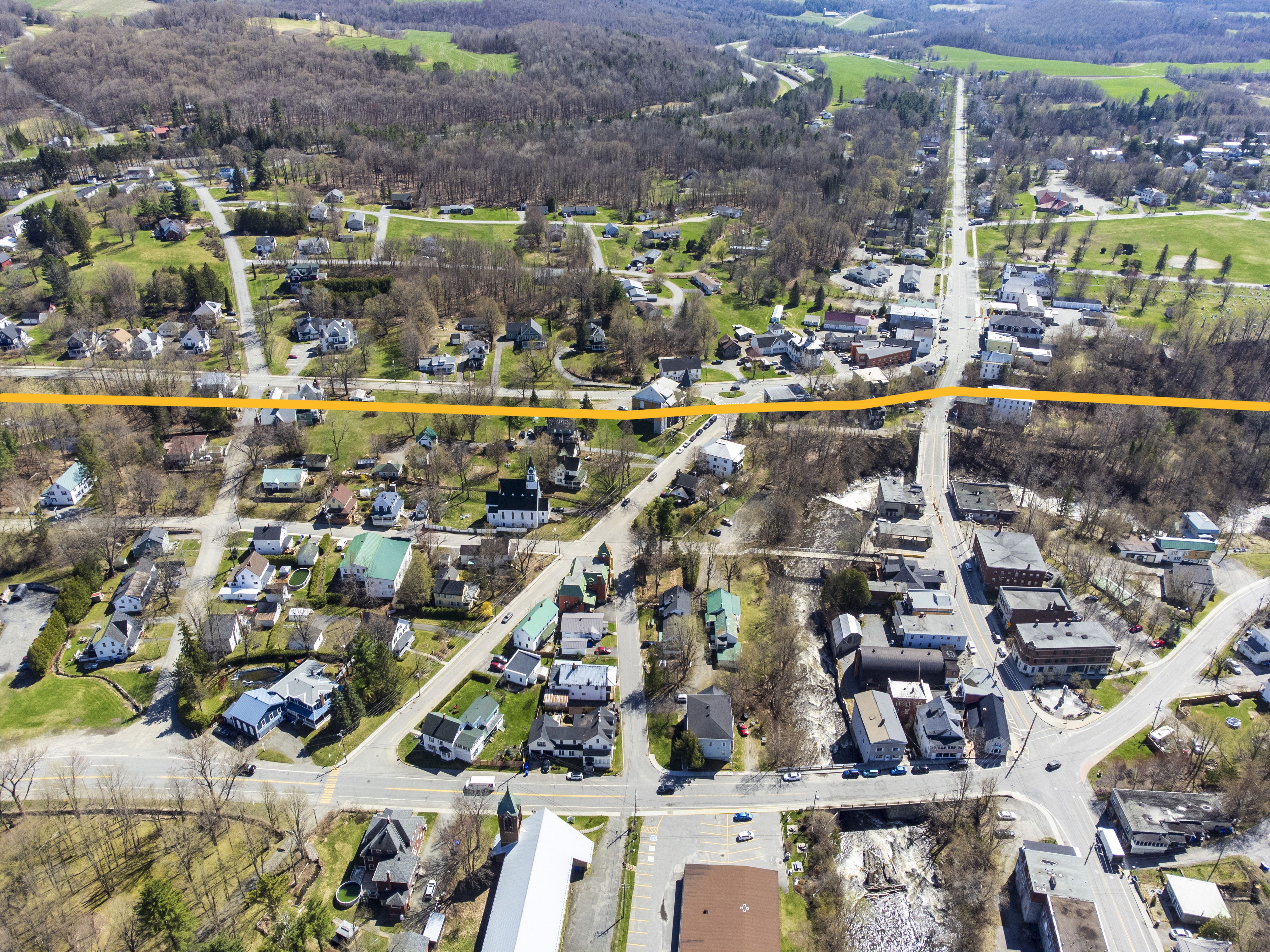 Du haut des airs, on dirait une seule municipalité. Il s’agit pourtant de Stanstead, au Québec, et Derby Line, au Vermont. (Jean Roy/La Tribune)