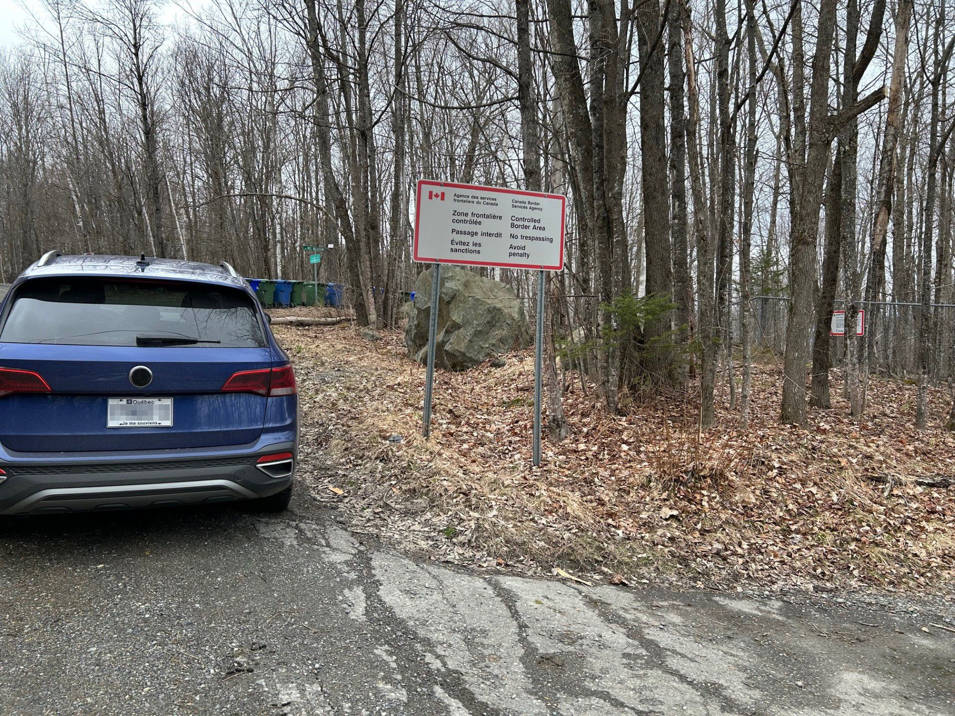 En chemin, nous arrivons au bout d’une rue québécoise, fermée par des blocs de béton et une vieille pancarte. La frontière est franchissable à pied, facilement.