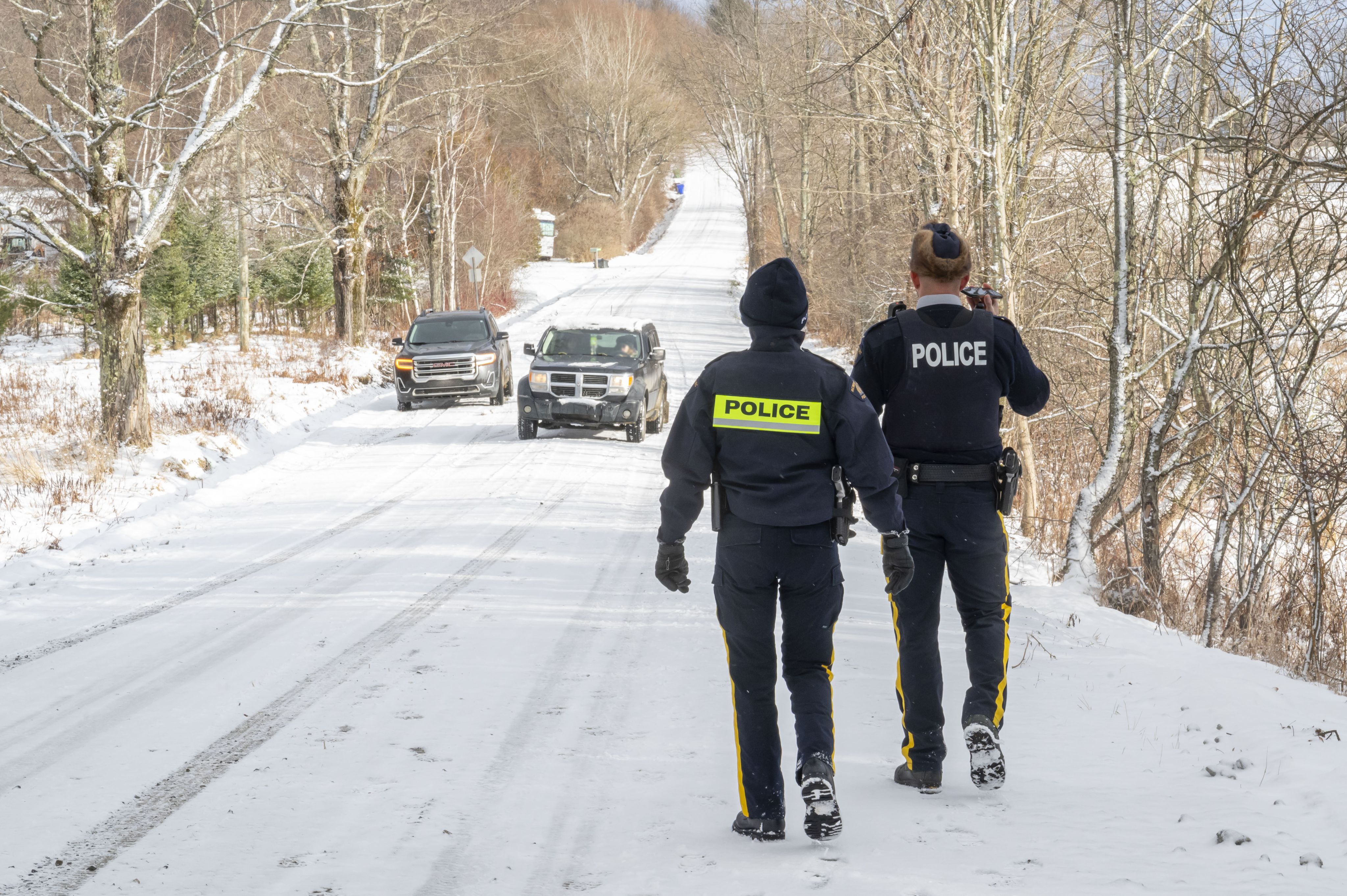 À peine sommes-nous arrivés qu'une voiture de la GRC surgit au bout de la longue route de campagne. Le policier vérifie la plaque de notre voiture avant de s’avancer vers nous.