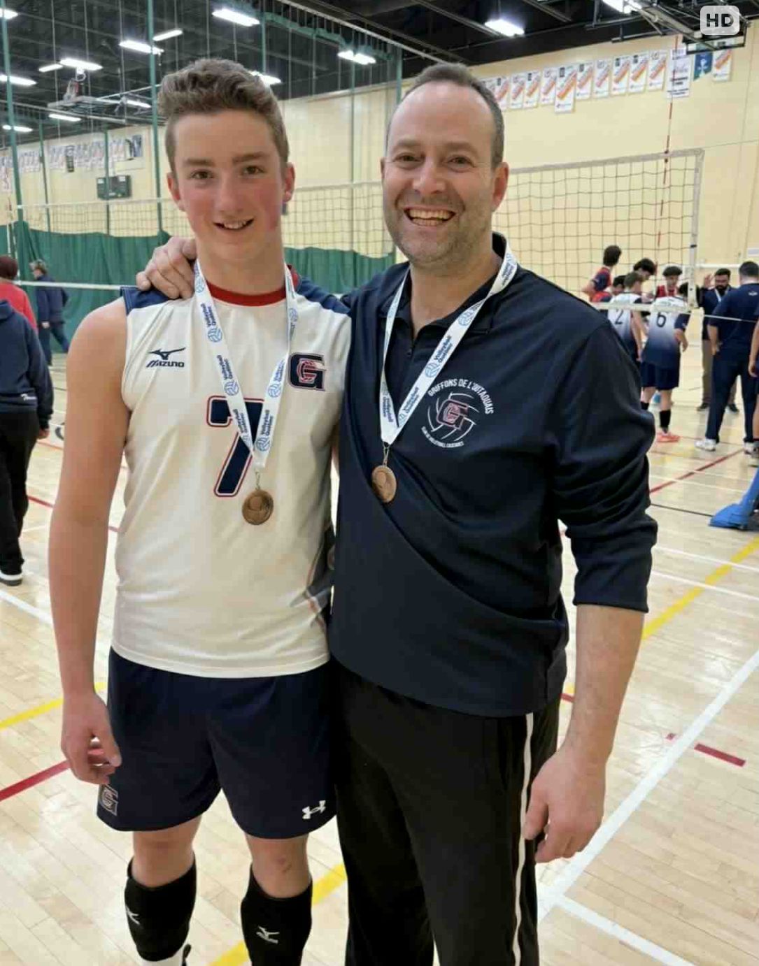 Tournoi de volleyball élite D1 2024: Samuel Cormier, médaillé de bronze et Gabriel Cormier, entraîneur des Griffons de l’Outaouais U16 à ce moment. (Photo: Geneviève Blais)