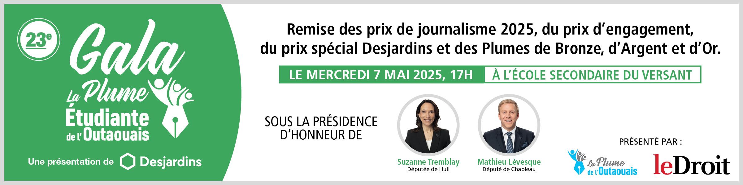Les meilleurs textes seront primés lors du Gala de La Plume Étudiante de l’Outaouais qui aura lieu le mercredi 7 mai 2025, 17h, à l’école secondaire Du Versant. Une présentation de Desjardins ainsi que de nos deux présidents honoraires, la députée de Hull, Suzanne Tremblay, et le député de Chapleau, Mathieu Lévesque.