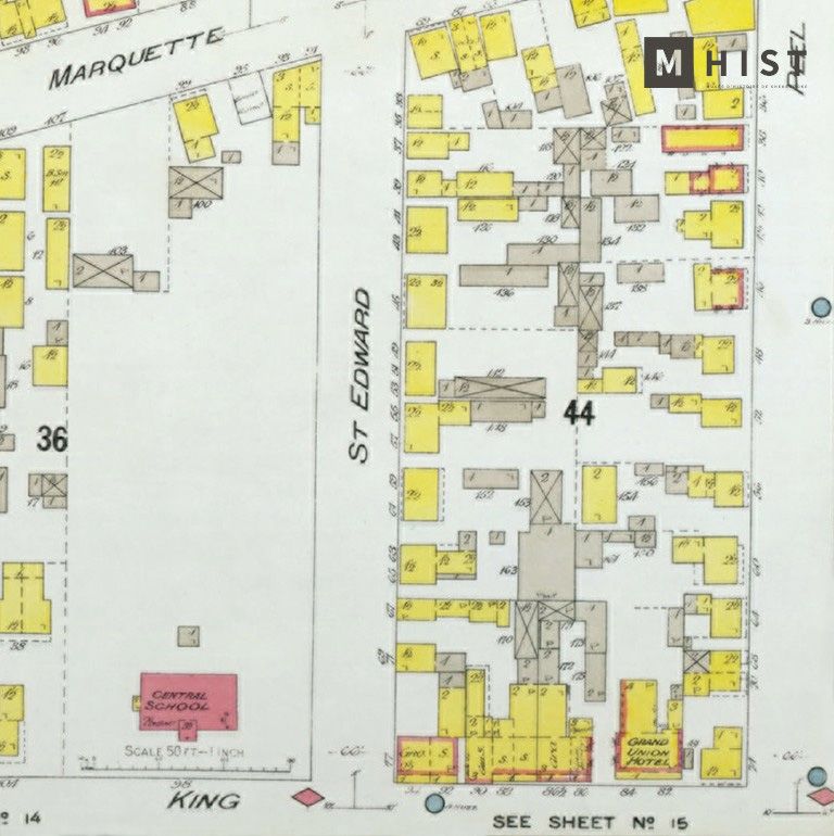 Le côté ouest, quant à lui, n’est construit qu’aux abords de la rue Marquette, une colline rocheuse recouvrant le reste de la rue. Le «Ledge» dans l’un des noms qu’elle porte (Ledge Street, «saillie», «rebord») pouvait désigner cette petite colline sur laquelle se trouvait une grande maison en bois de deux étages et demi.