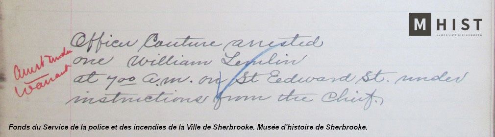 Le 28 janvier 1910, l’officier Couture procède à une arrestation sur la rue St-Édouard. Des exemples, comme celui-ci, sont nombreux dans les archives des registres des interventions policières à Sherbrooke. (Photo Fonds du Service de police et d’incendie de la Ville de Sherbrooke, Musée d’histoire de Sherbrooke)