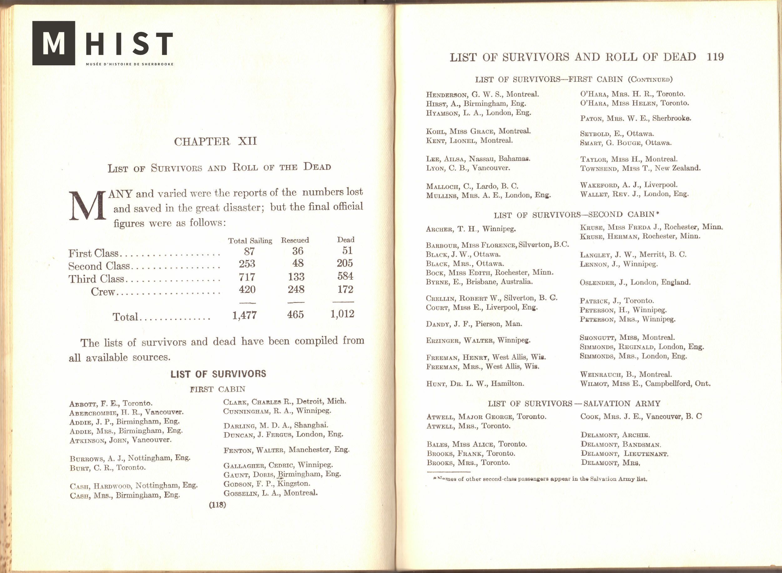 Rapidement en 1914, la liste des passagers – survivants et décédés – est connue. Parmi les survivantes dans les cabines de première classe, on y trouve le nom de Mme W.E. Paton, de Sherbrooke. (Photo The tragic story of the Empress of Ireland, 1914, p.118-119. Collection John Hayes, Musée d’histoire de Sherbrooke)