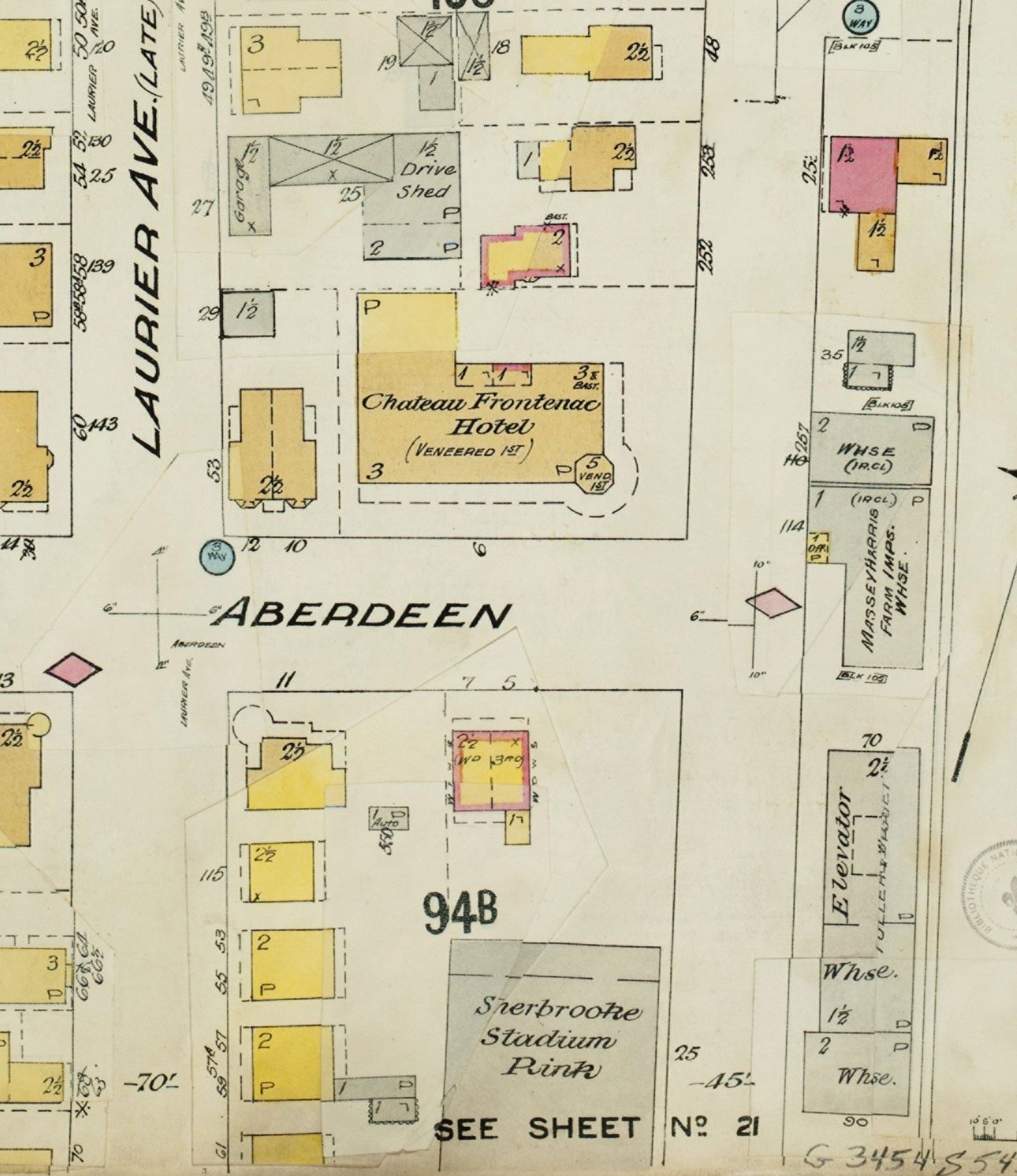 Carte où apparaît le Sherbrooke Stadium Rink, en 1907. (Plan d’assurance de la Ville de Sherbrooke, Charles E. Goad, Musée d’histoire de Sherbrooke)