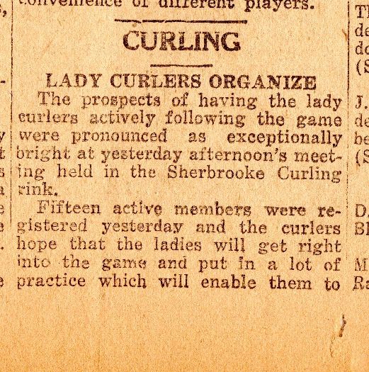 Si, au cours des premières décennies, le curling est l’affaire des hommes, les années 1920 (ne sont-elles pas folles, après tout!) fissurent ce clivage. En effet, on ne saurait oublier le Ladies Sherbrooke Curling Club, qui voit le jour en janvier 1922, et réunit dans le même bâtiment les dames de Sherbrooke autour du jeu, plusieurs après-midis par semaine.