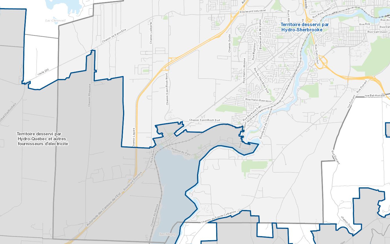 Comme on peut le voir sur la carte ci-dessous, la ligne bleue délimite le territoire desservi par Hydro-Sherbrooke. On aperçoit le secteur de Deauville en gris, à l’ouest et au nord du lac. En résumé: le territoire municipal et celui du réseau électrique ne sont tout simplement pas identiques. Deux histoires différentes, deux évolutions au fil des circonstances… Et deux factures!