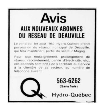 Et voilà où se trouve la réponse: bien qu’étant un secteur de l’actuelle ville de Sherbrooke, Deauville (qui s’appelle Petit-Lac-Magog jusqu’en 1945) n’est pas desservie par le Service du Gaz et de l’Électricité de Sherbrooke (qui devient Hydro-Sherbrooke en 1963). Hydro-Québec prend possession du réseau municipal de distribution d’électricité de Deauville en août 1980. Au terme d’une transaction de 365 000$, Deauville rejoint le réseau de distribution d’Hydro-Québec plutôt que celui d’Hydro-Sherbrooke.