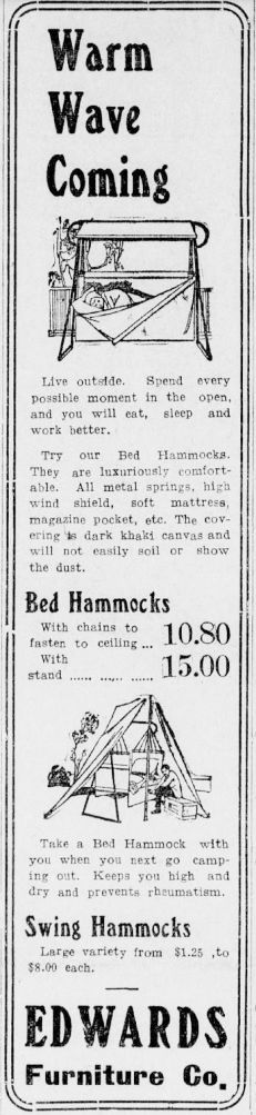 Les commerçants locaux s’ajustent à l’engouement pour le «sport du camping». L’épicier W. H. Fuller, par exemple, recommande aux campeurs de l’appeler pour commander leurs conserves – sans doute la base de tout bon repas au feu de bois! Des commerces comme Edwards’ Furniture Co. offrent des hamacs suspendus pour éviter l’humidité du sol, ou encore des toiles kaki pour les plus aventuriers. Quant au réputé magasin J. S. Mitchell & Co. (Avant la Brûlerie, il y avait une quincaillerie), il devient un véritable spécialiste de l’équipement de camping: tentes, sacs à dos, lampes de poche, rien ne manque. Et ça dure jusqu’au milieu du 20e siècle.